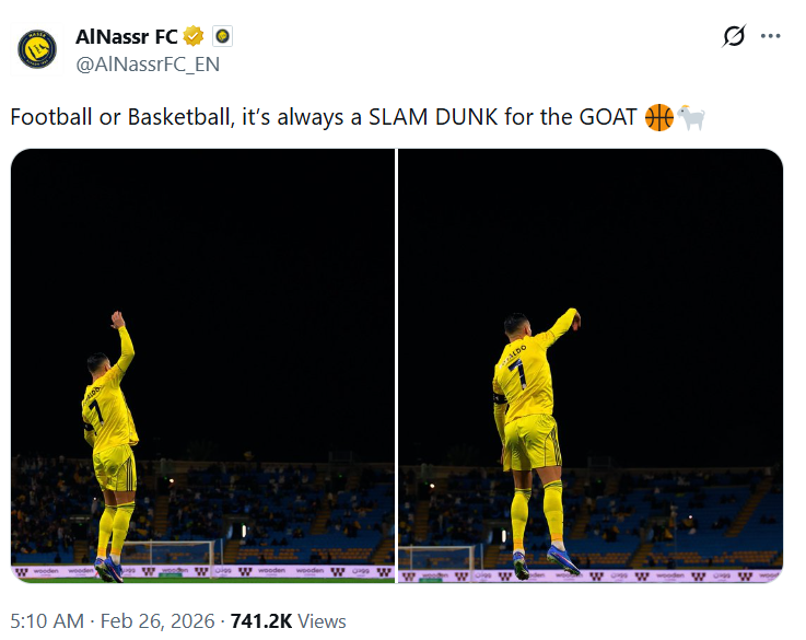 Al Nassr's English social media account on X also joined in, posting two photos of Ronaldo's new celebration with the caption: "Whether it's football or basketball, with the greatest player of all time (GOAT), it's always a perfect slam dunk."