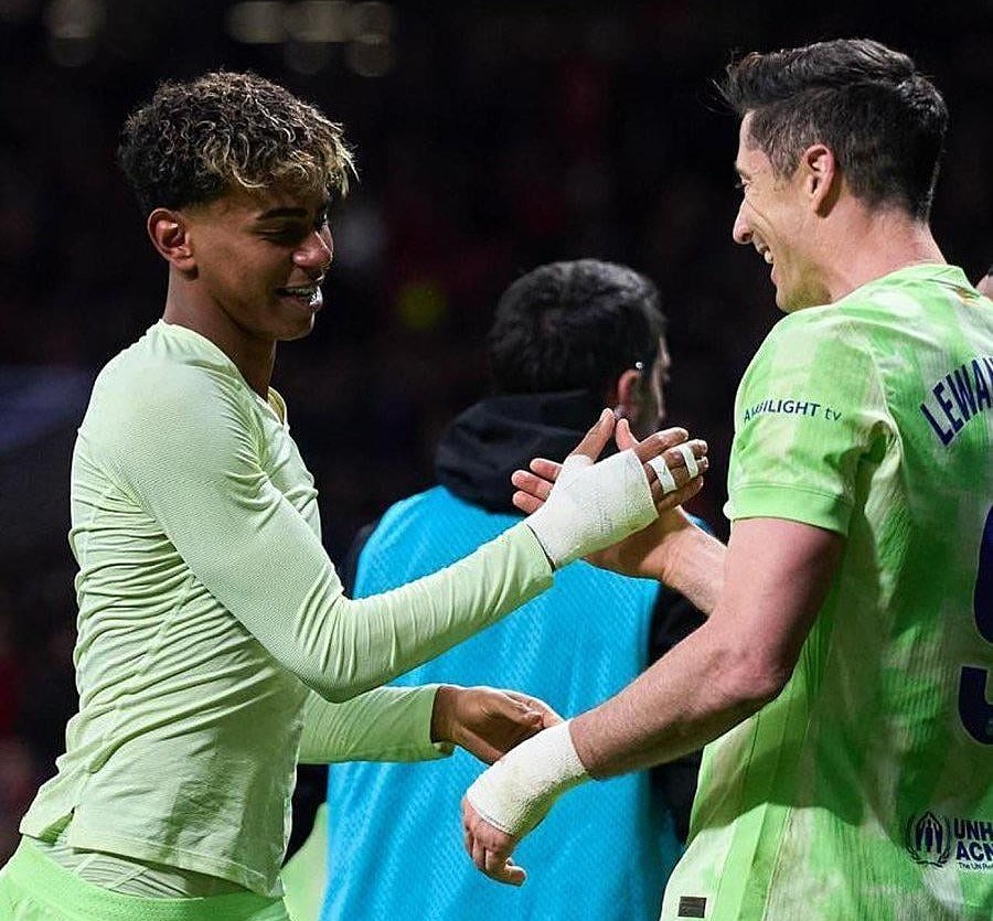 Yamal and Lewandowski celebrate a goal, each with one hand taped around the wrist area. Photo: EFE