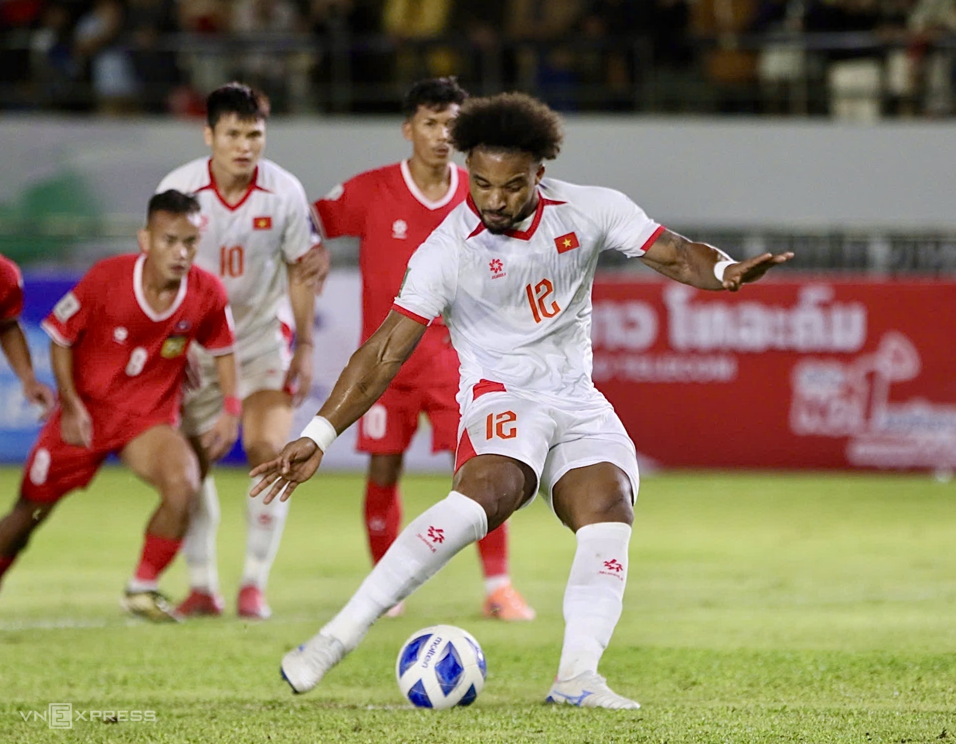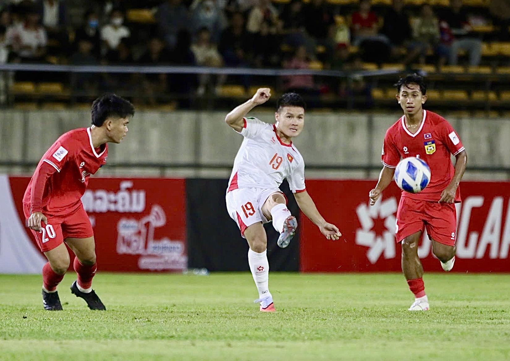 In the 60th minute, Tuan Hai (in white) hit the crossbar. Eight minutes later, he broke through and passed from the left byline, forcing Phetdavanh Somsanith to slide and illegally use his hand, resulting in a penalty for Vietnam.