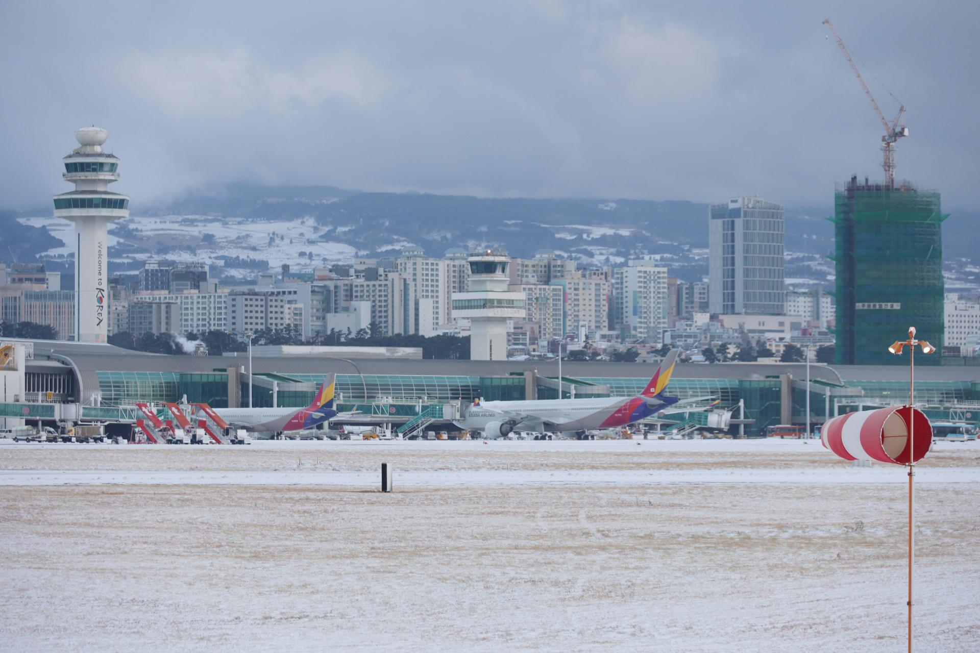 Heavy snow blankets the runway at Jeju international airport on 8/2. Photo: Yonhap