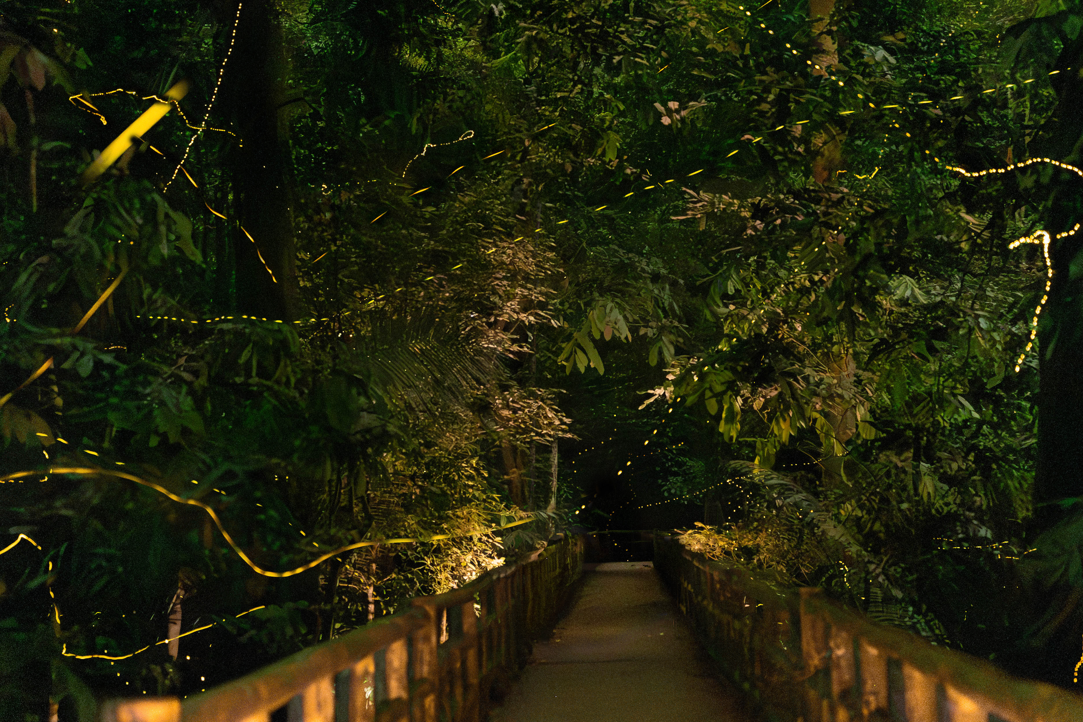The shimmering light of the firefly swarm illuminated the bridge leading to the Cave of Ancient Man.