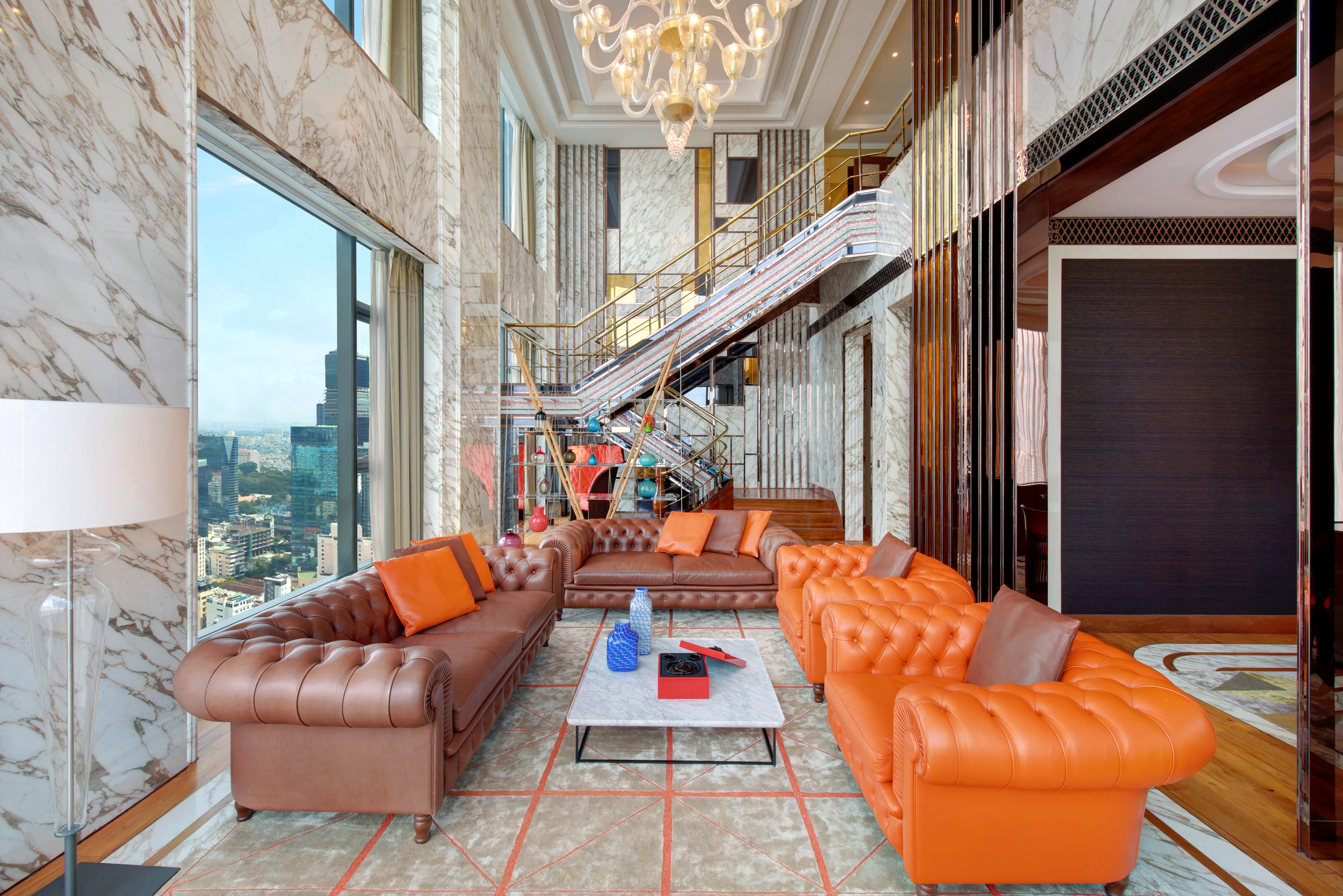 The 39-story building features 62 suites, 224 guest rooms, and 89 serviced apartments. The hotel collaborates with prominent furniture brands like Visionnaire, Colombostile, Giorgetti, and Poltrona Frau to create living spaces with a distinct European aesthetic.
