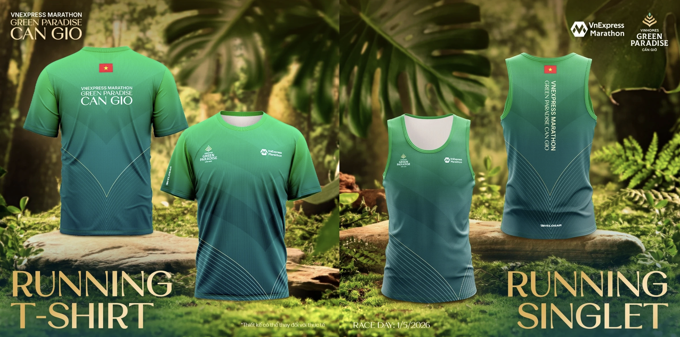 Two versions of the T-shirt and singlet for the VnExpress Marathon Green Paradise Can Gio 2026 race kit. Photo: VnExpress Marathon |