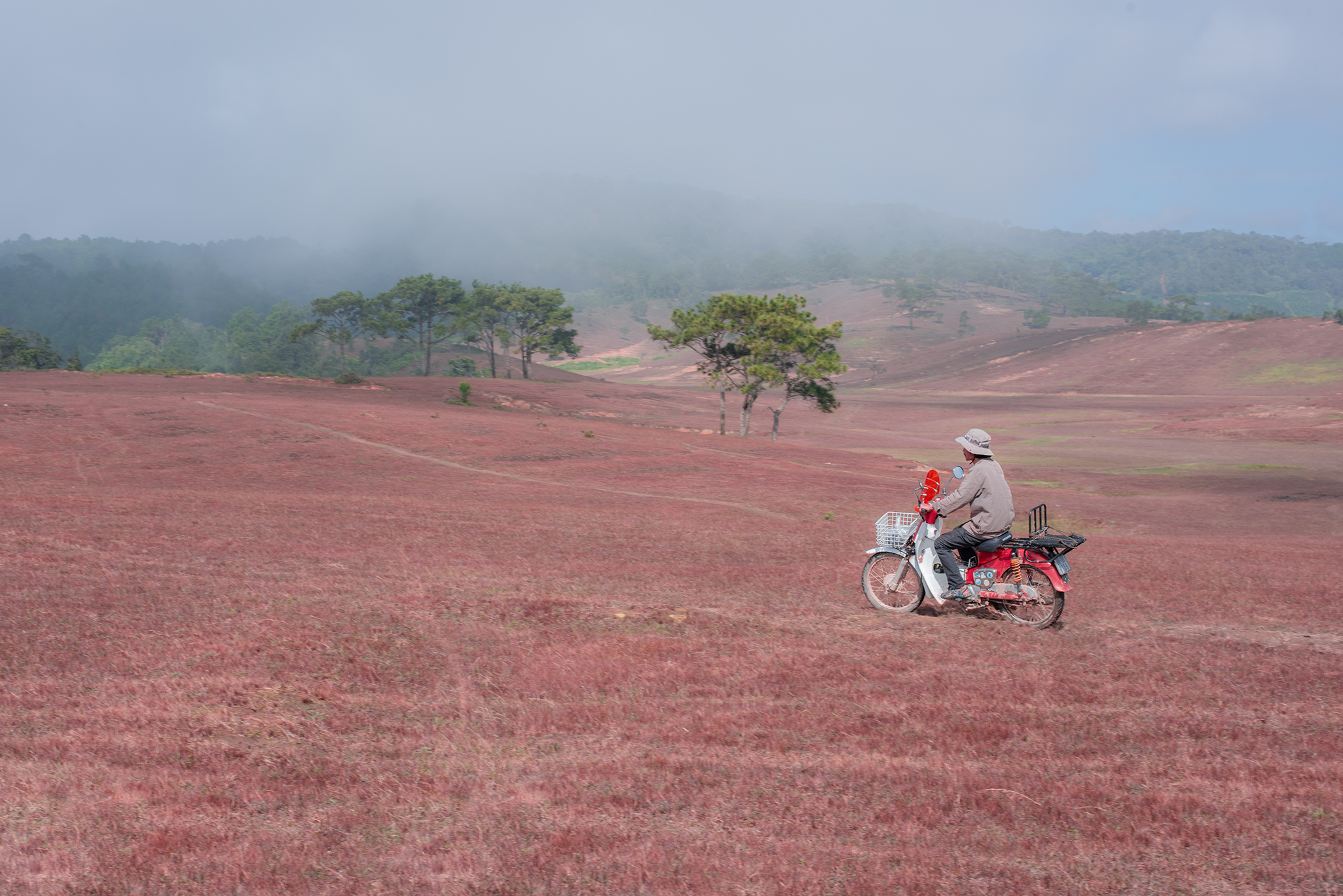 The ideal time to observe the pink grass and engage in cloud hunting is between 5-6 a.m., when the morning dew creates a captivating "snow grass" effect. While motorbikes and oto can reach the hilltop, many prefer to park along the trail and walk into the pine forest for photo opportunities. Visitors can also enjoy the sunrise by the lake nestled amidst the grass hill.