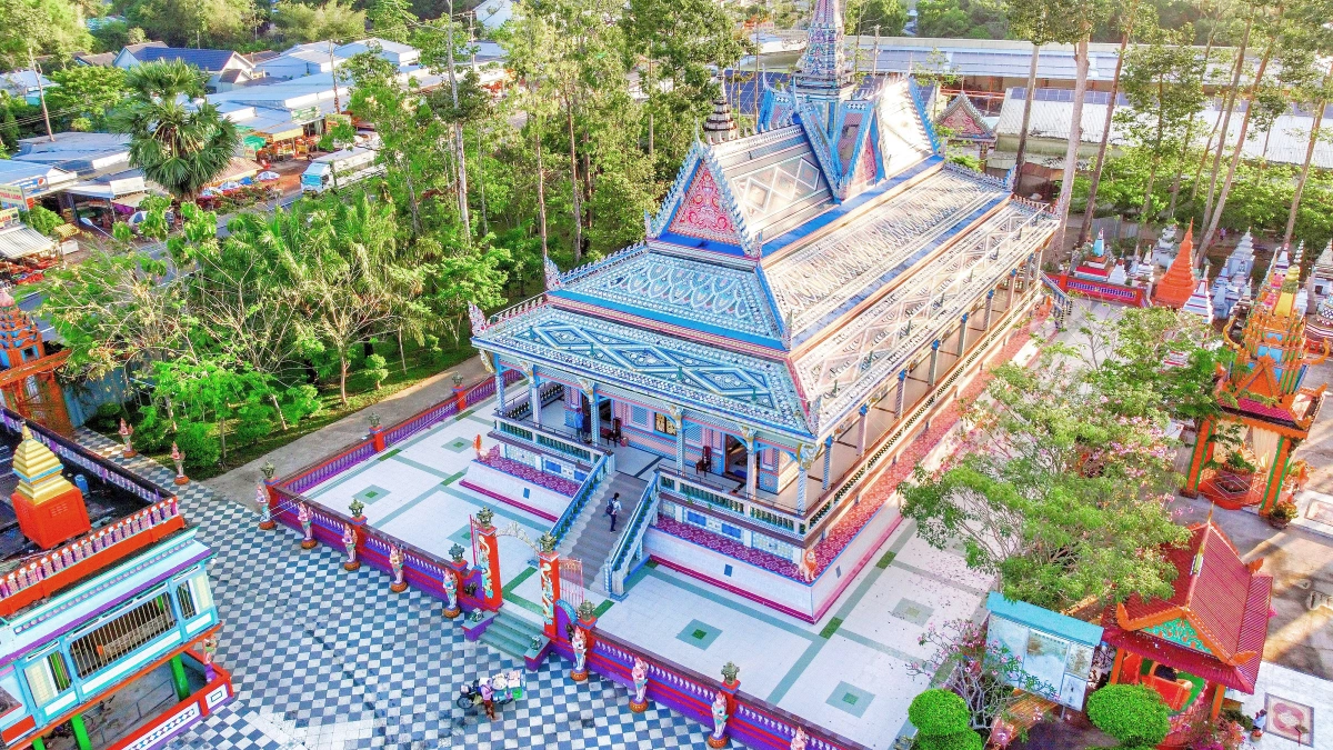 Another notable Khmer pagoda, Chen Kieu Pagoda (Khmer name: Sa Lon), impresses with its unique architectural style. Unlike traditional religious buildings, it's decorated with thousands of colorful ceramic shards, creating a vibrant and distinctive appearance.