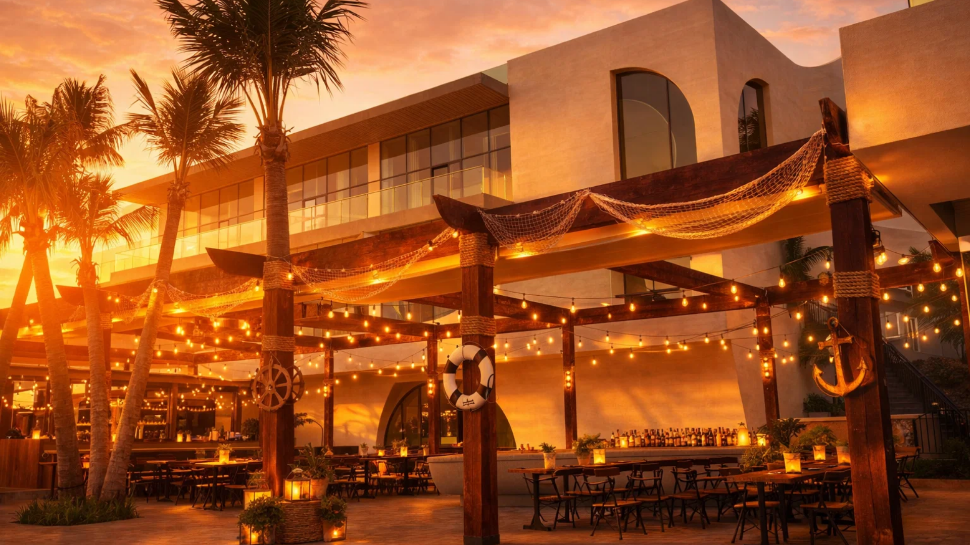The outdoor area features a swimming pool and a bar shaped like an ancient wooden boat, complete with an anchor and rudder. According to a restaurant representative, this imagery symbolizes the spirit of freedom and the desire to conquer the ocean for those who love the sea.