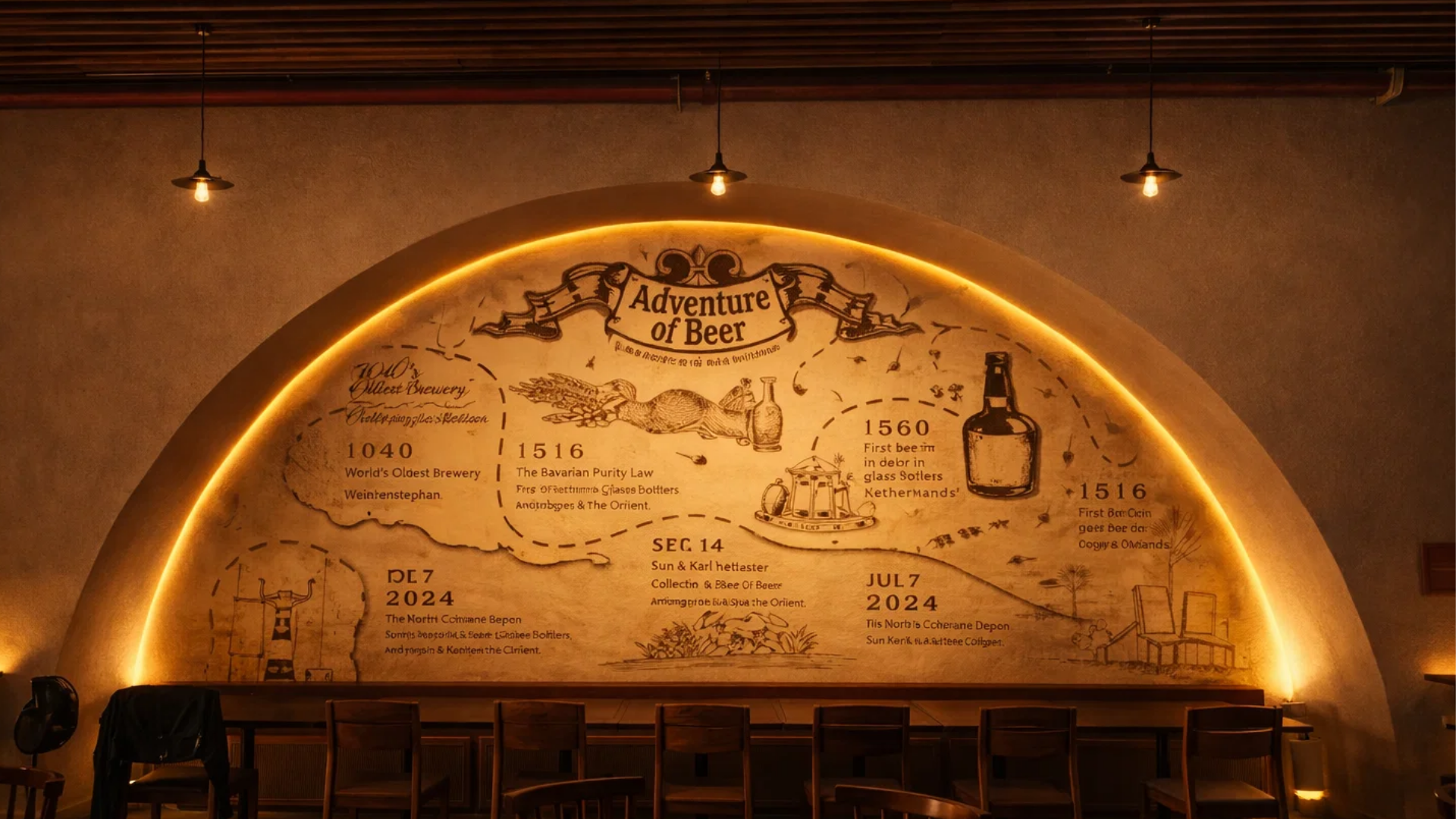 A unique highlight lies in the graphic wall art, which vividly recounts the historical narrative of "The Adventure of Beer."