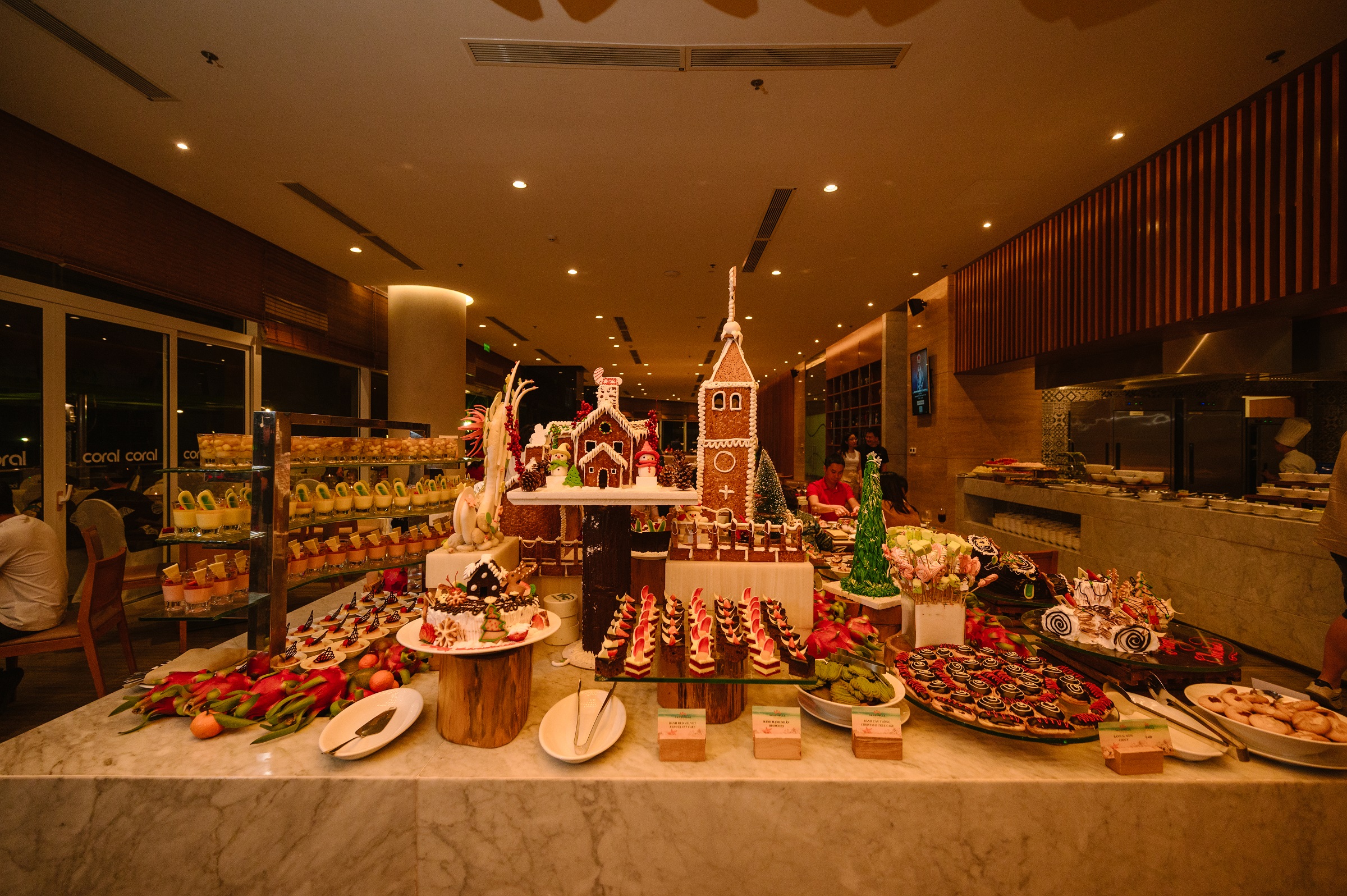 A highlight is the Christmas Eve buffet on 24/12, priced at 1,9 trieu dong per guest. Diners can enjoy the buffet with unlimited wine and beverages. Additionally, Santa Claus will distribute random gifts to children, accompanied by vibrant artistic performances from the dance team.