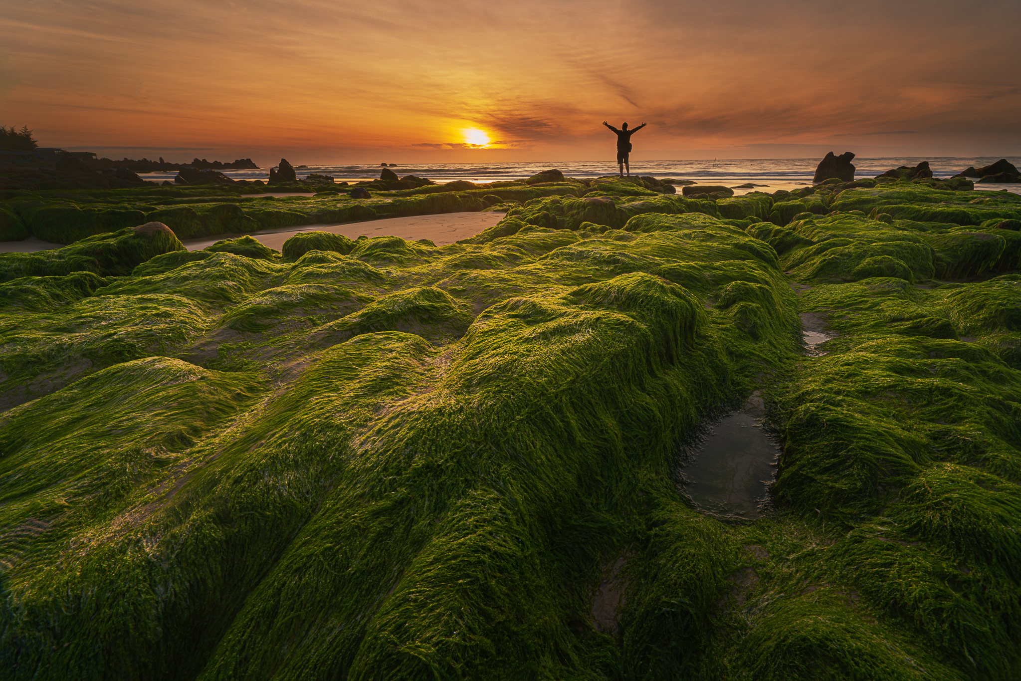 Sunrise over the moss beach in Co Thach, Lam Dong, about 100 km from Phan Thiet. This moss beach has gained popularity in recent years. Visitors need to wake up early, around 5 a.m., to capture the best moments. |
