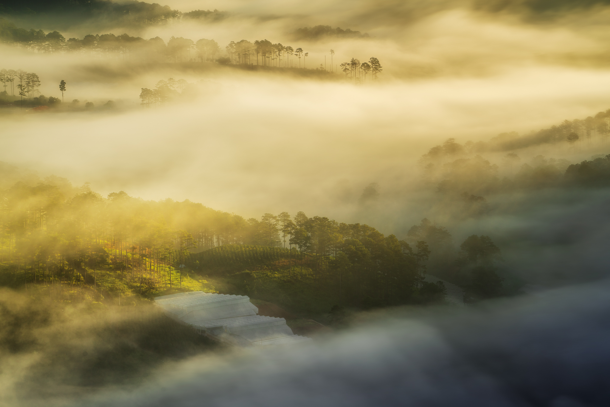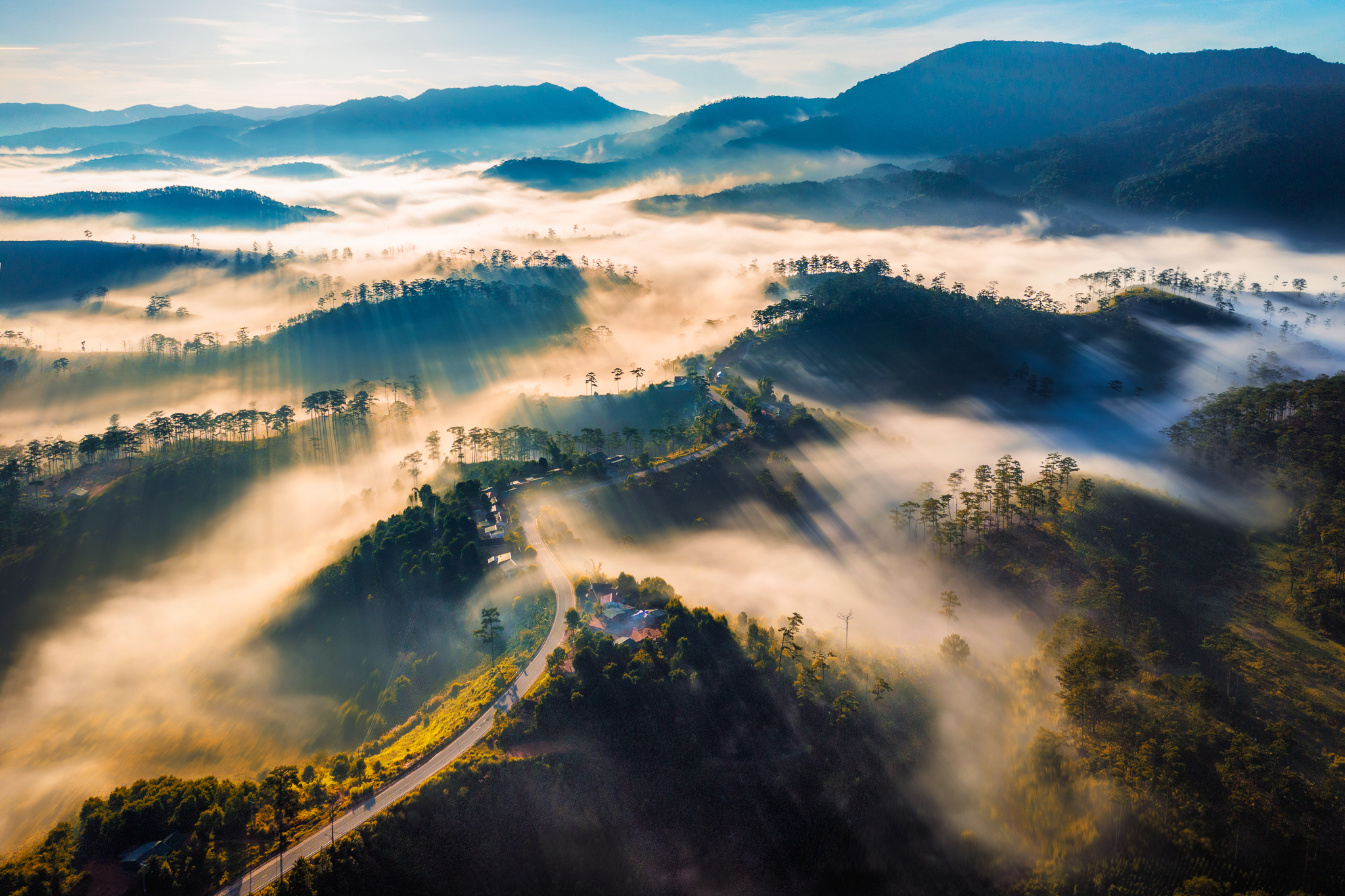 Klong Klanh Pass, about 50 km from Da Lat. To capture this shot, Viet had to depart at 2:30 a.m. to catch the sunrise and the sea of clouds. He explains that capturing a sea of clouds requires specific weather conditions. Rain a few days prior, followed by sunshine, creates sufficient humidity. Cold nights produce mist at sunrise, and light winds below 5 km/h allow the clouds to settle.