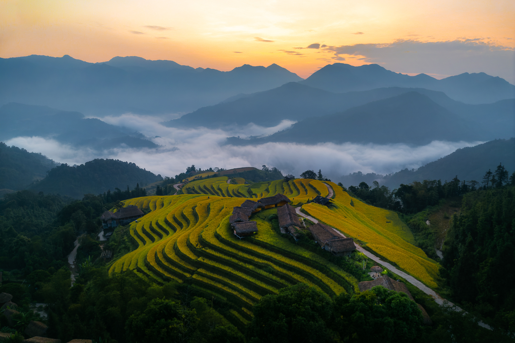 Viet aims to complete a collection of sunrise photographs from across Vietnam but acknowledges the challenge of finding compelling angles in every location. This image showcases the terraced rice fields of Nam Hong in Hoang Su Phi, Tuyen Quang. The houses are homestays built atop hills, offering panoramic views of the rice paddies.