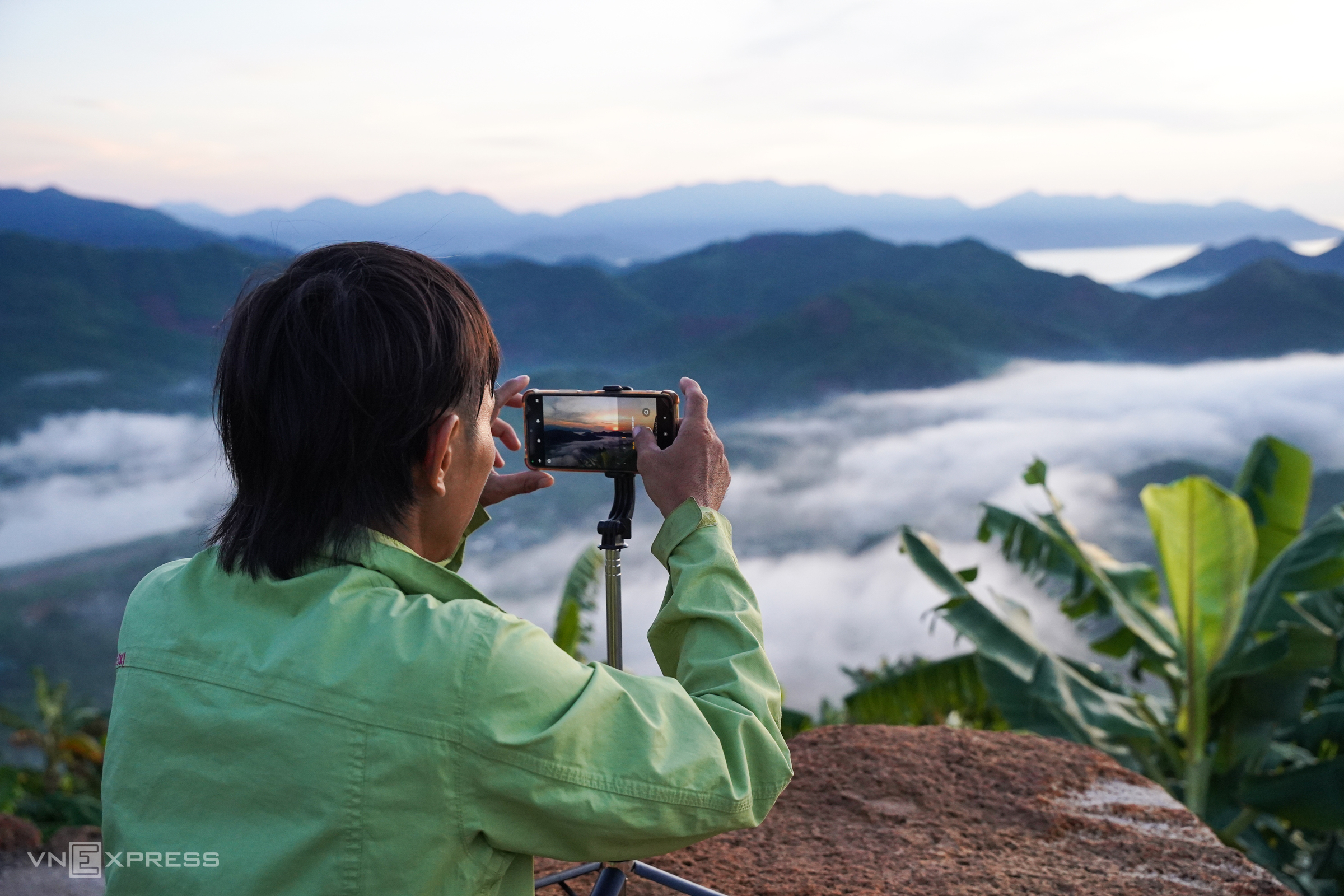 Nguyen Kaio sets up his phone to record a time-lapse of the clouds "flowing" over the mountain peaks. He says the clouds display different "colors" and distributions each day.