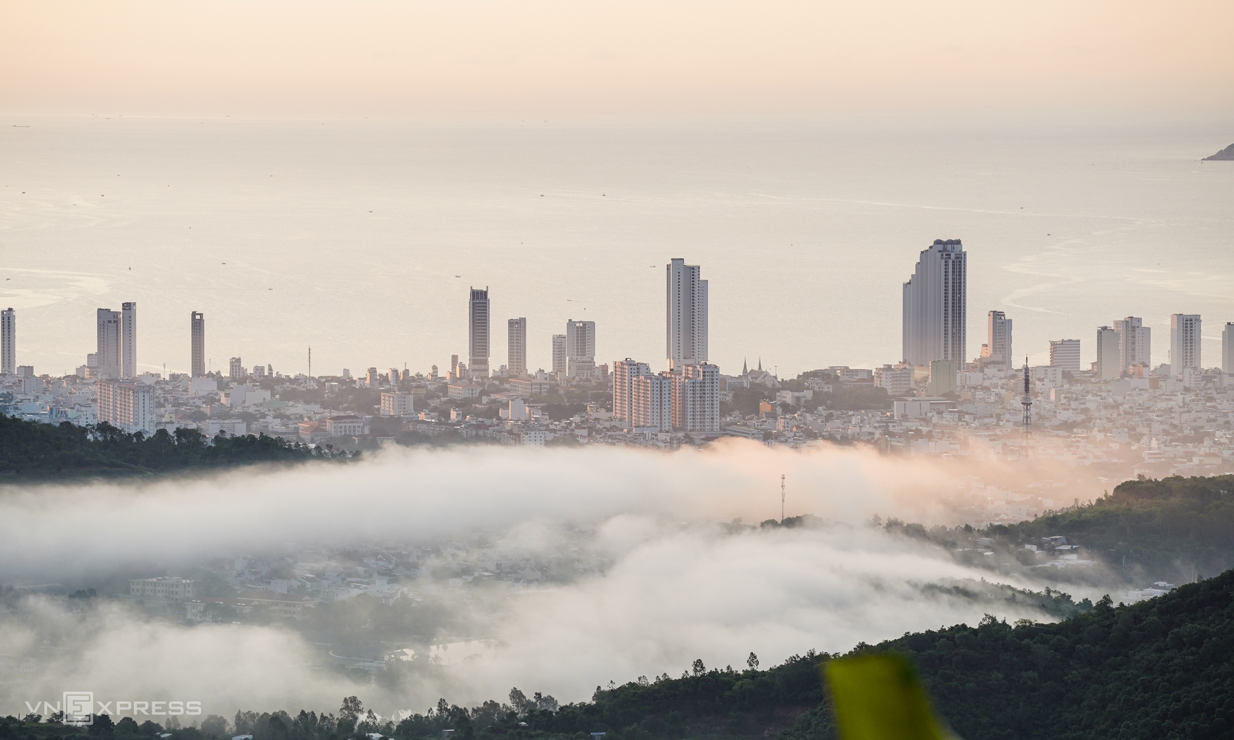 Nha Trang city center viewed from the mountain, interspersed with layers of clouds "continuously flowing" over the mountains. |