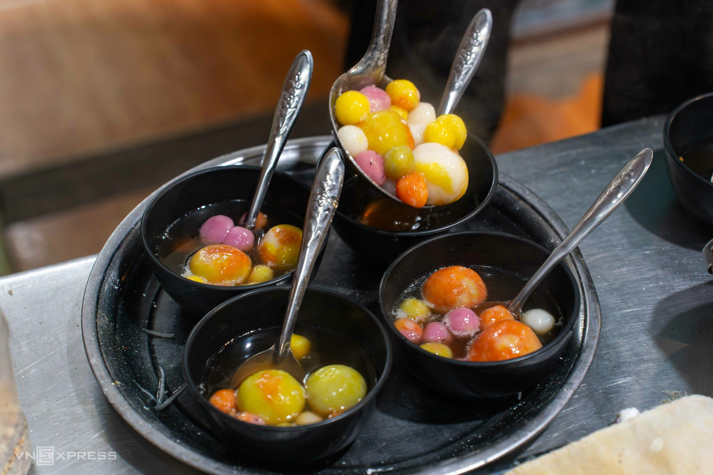 Those bowls of thang den at Ms. Nga's stall, with the larger ones being troi tau cakes filled with mung bean paste. Photo: Hoang Giang