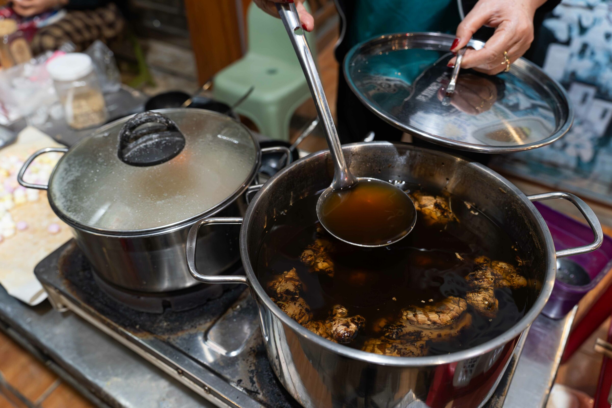 Diners often let the small cake melt in their mouth to fully experience the sweet, rich taste of the broth, the pungent warmth of roasted ginger, and the nutty flavor of sesame and peanuts.