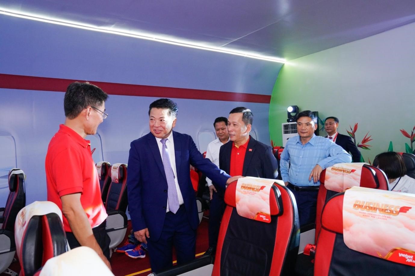 Minister of Construction Tran Hong Minh (second from left) visits the Vietjet booth on the morning of 28/8. Photo: Vietjet