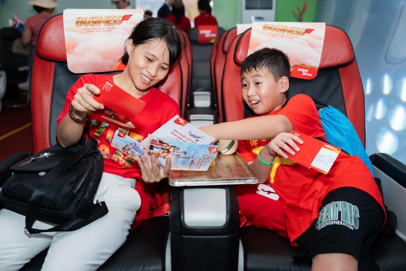 A large passenger cabin, similar in size to a real aircraft, was set up by Vietjet at the exhibition, offering visitors an authentic experience, from Business class with comfortable large leather seats to hot, delicious meals and drinks available on flights.