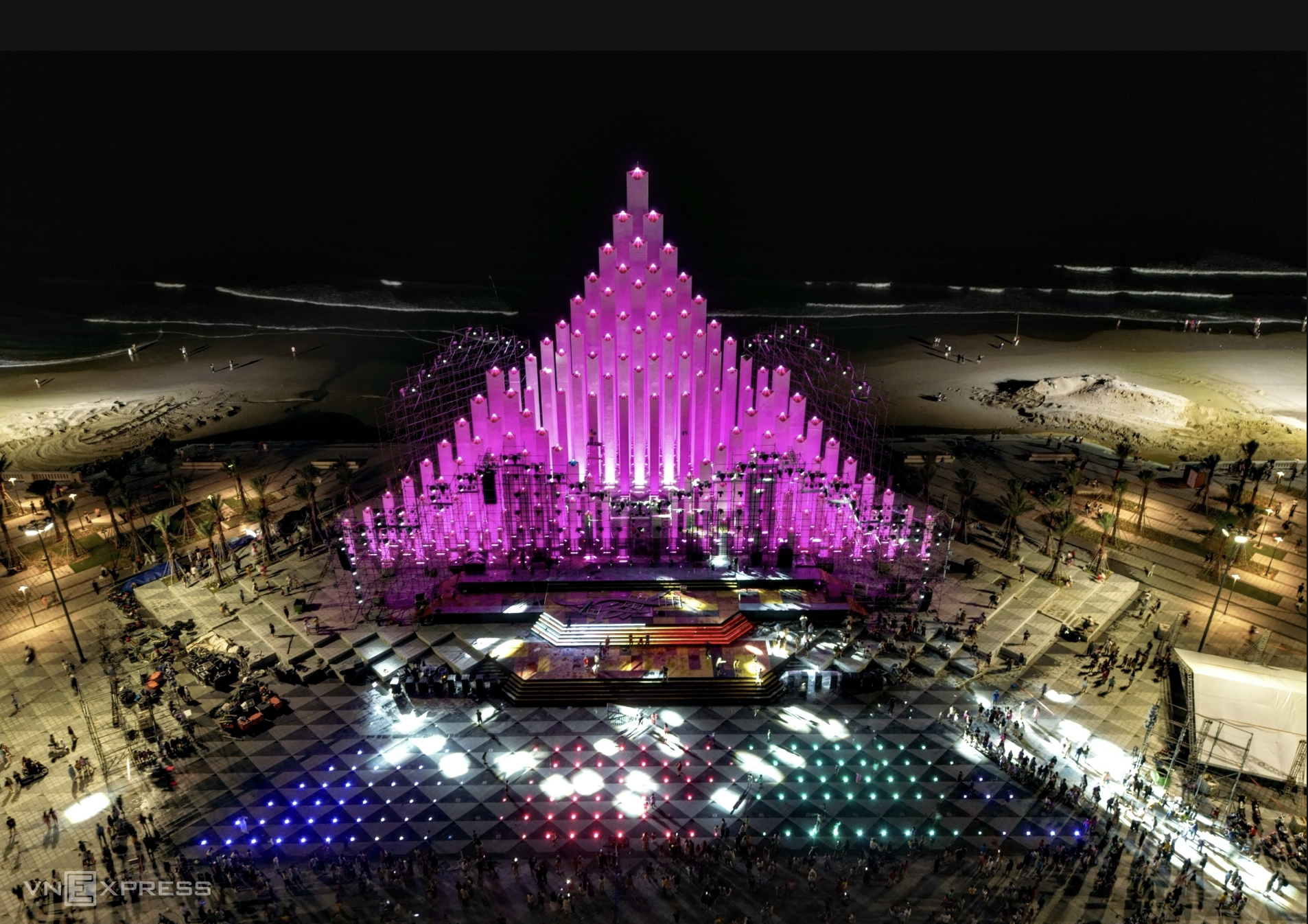 Tam Thang Tower illuminated with changing colors on Back Beach. Photo: Truong Ha |