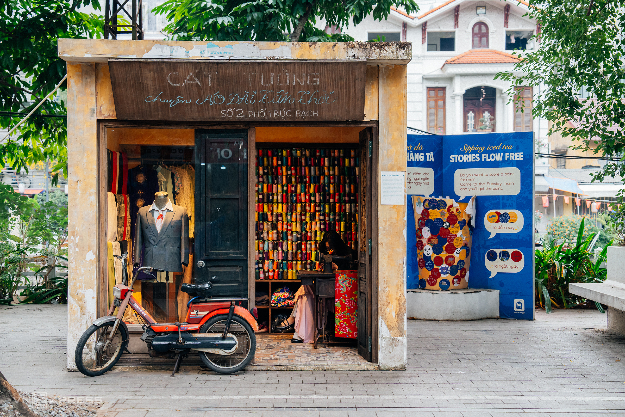 On the Truc Bach walking street, Ngoc Xa islet, visitors can check in at a retro tailor shop, prominently decorated with hundreds of colorful spools of thread. |