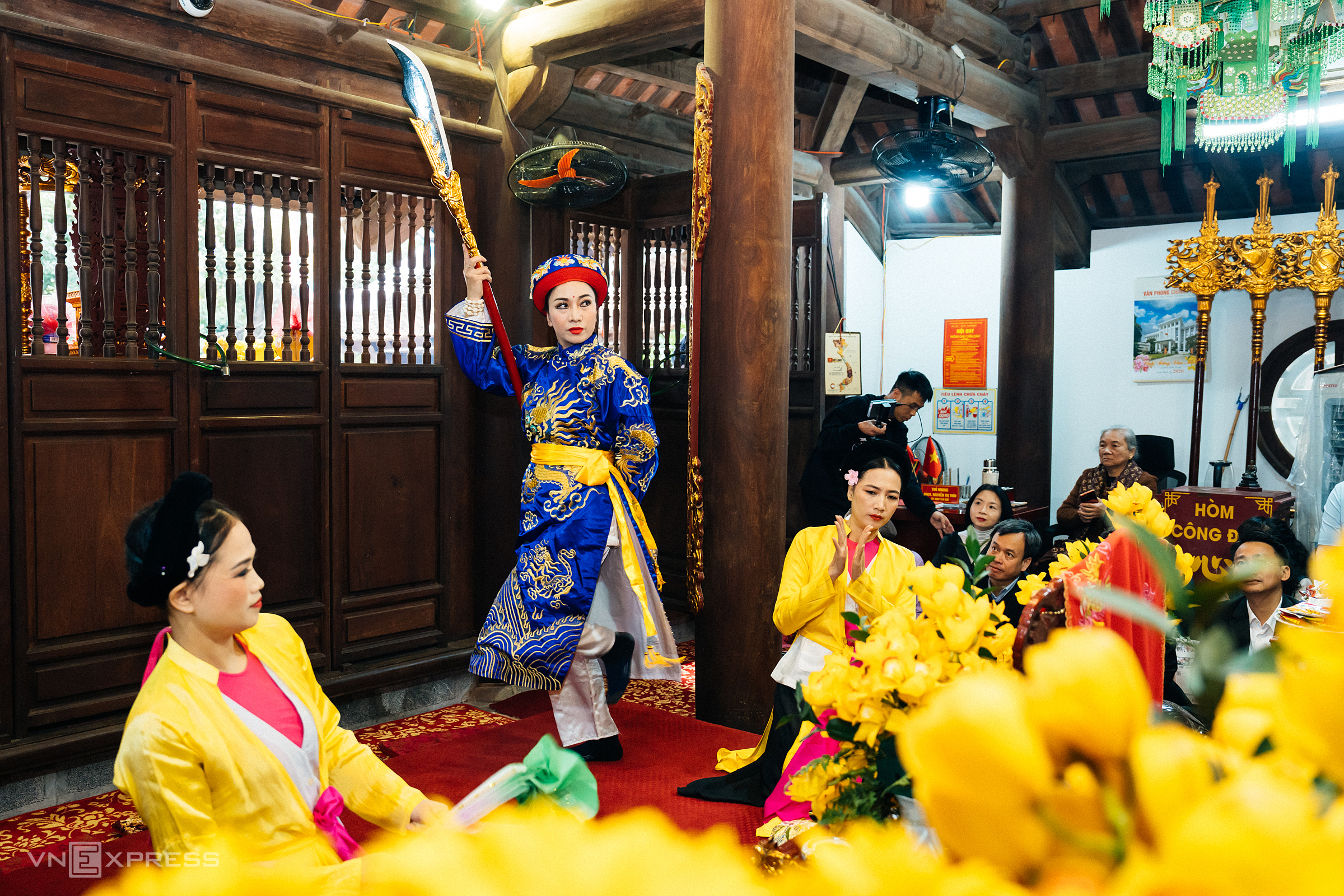 Visitors watch a hau dong performance at Den Thuy Trung Tien.