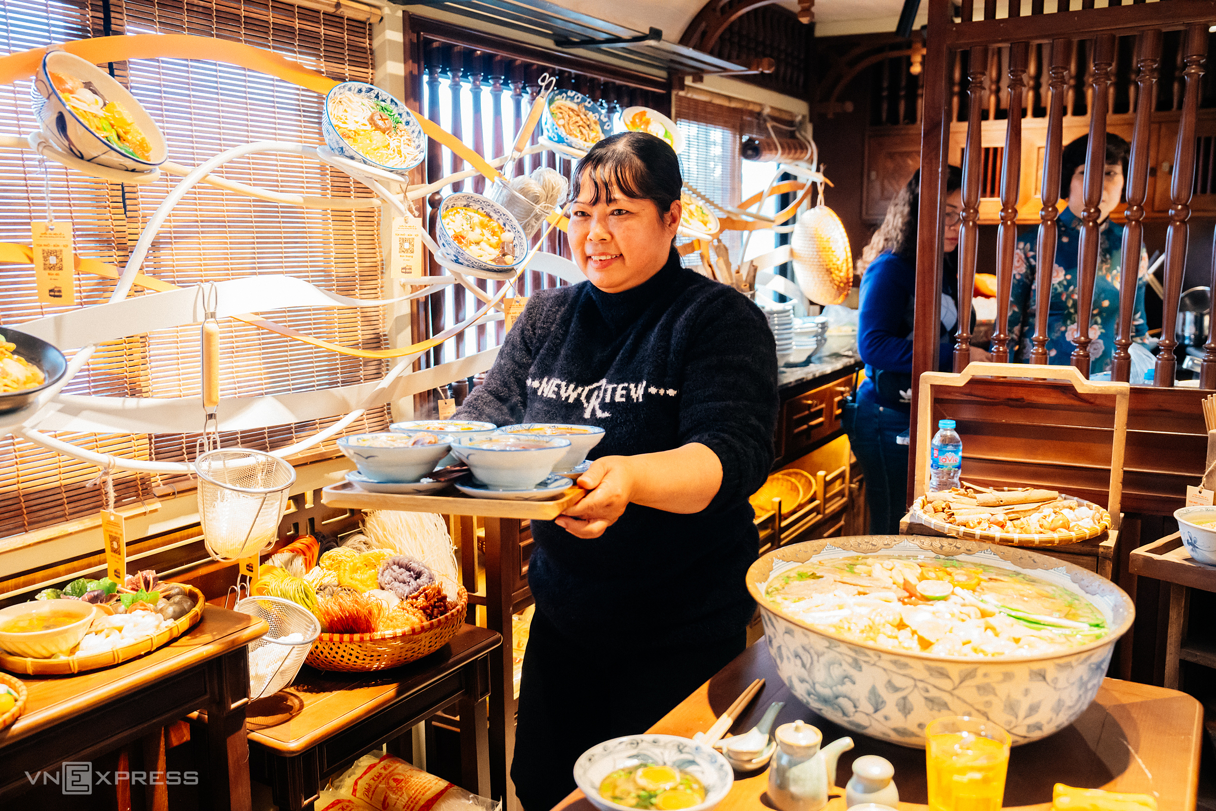 The "Pho - Bun - Soi" tram car has two stories, with chefs preparing pho on the first floor and serving tourists on the upper floor.