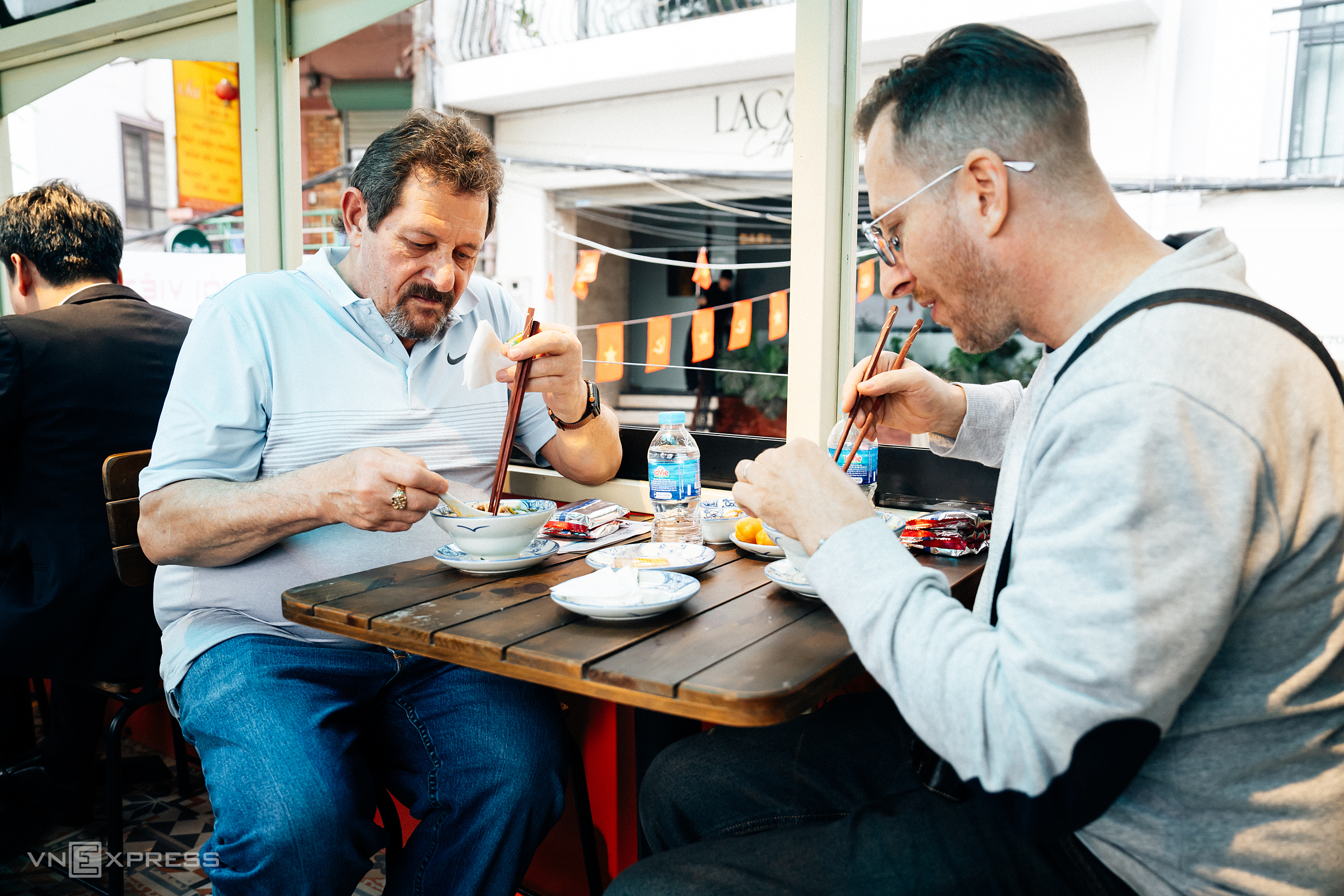 Lean Rider (left), an American tourist, visits Vietnam to see his son Dan (right), who works in Hanoi. He stated that he loves Vietnamese pho and found this new tour interesting, enjoying a meal inside a recreated tram car. |