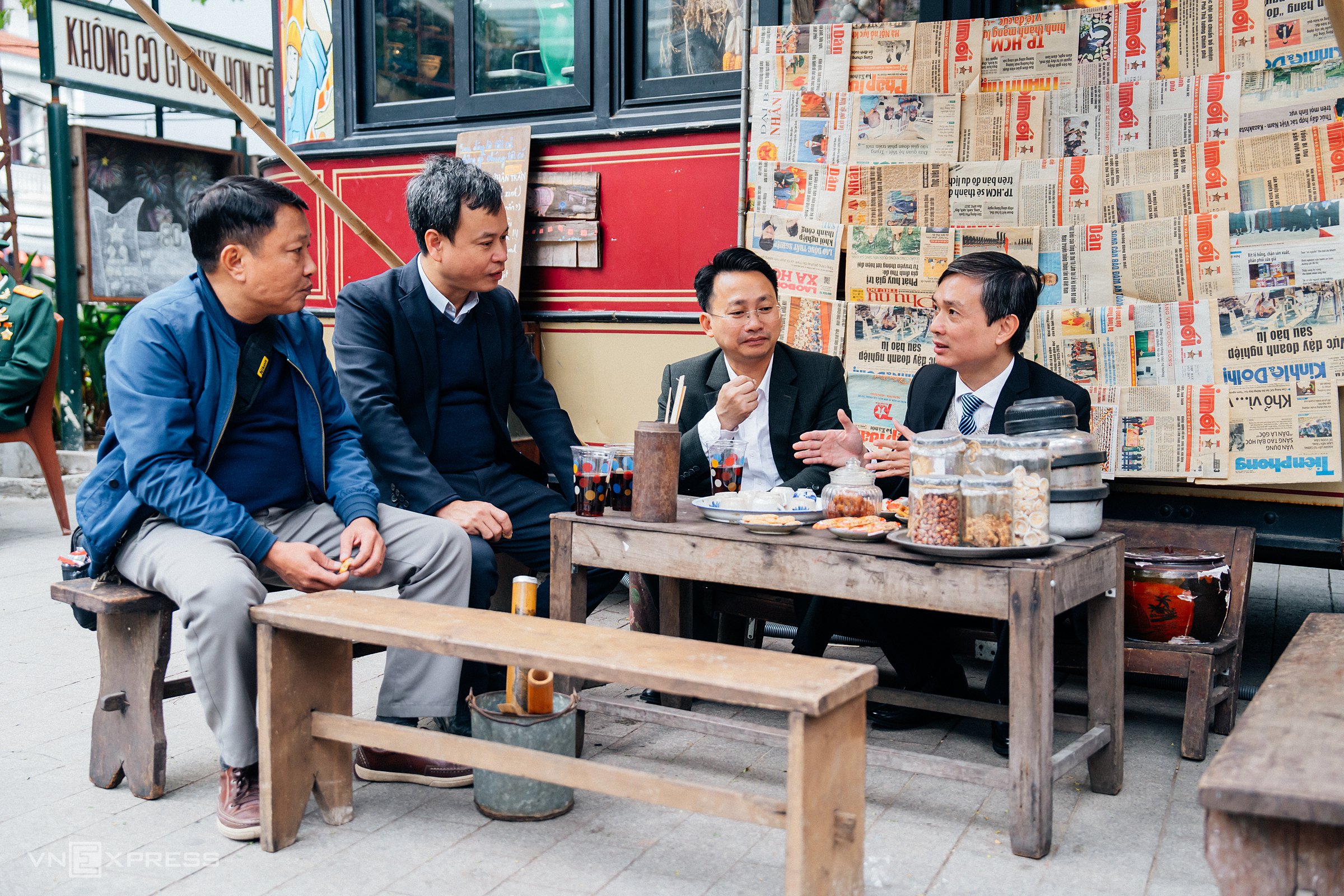 Wooden tables and chairs, traditional tea, and peanut candy are interspersed between the tram cars as rest stops, offering visitors a glimpse into the daily life of Hanoians of yesteryear. |