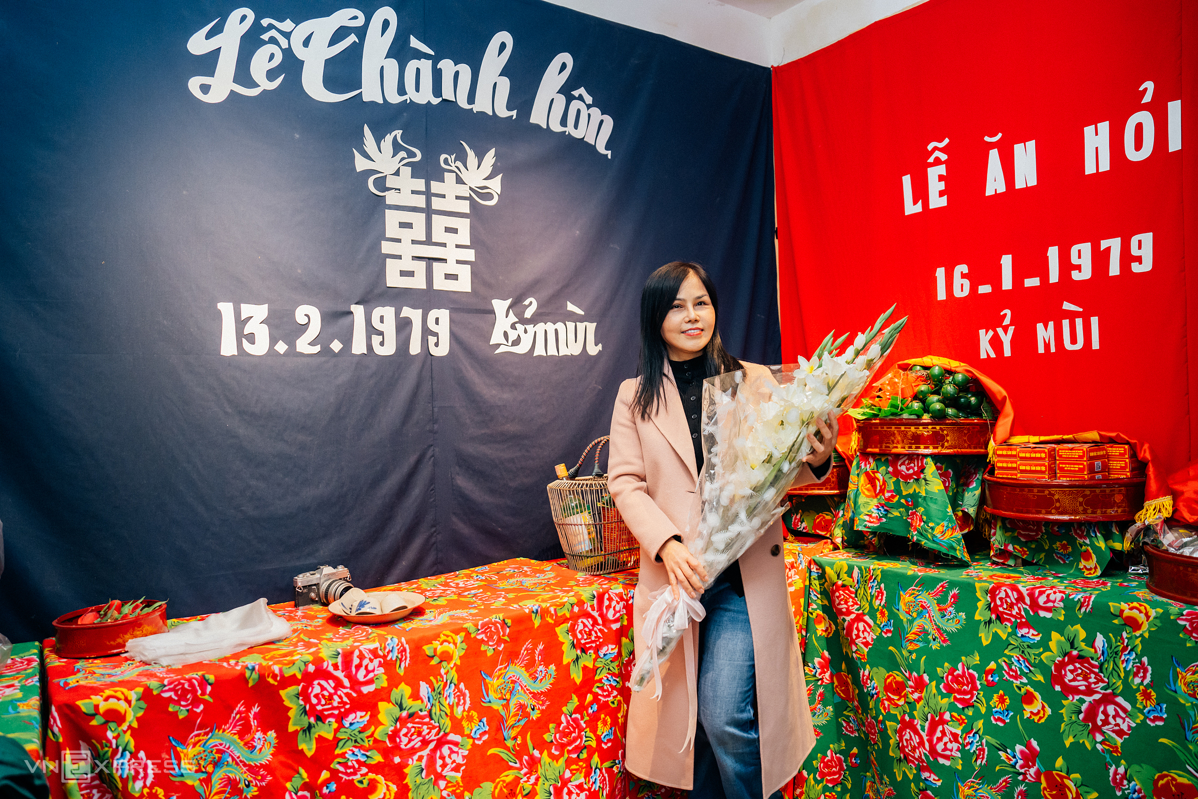 A recreated Hanoi wedding scene from the subsidy era (1976-1986), featuring a peacock-patterned tablecloth and betel and areca trays for the engagement ceremony. White gladiolus wedding bouquets were a popular trend among brides of that era. |