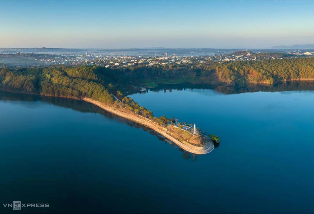 A view of Bien Ho (Sea Lake) featuring a statue of Bodhisattva Quan Am situated on a strip of land extending into the middle of the lake. *Photo: Phan Nguyen*