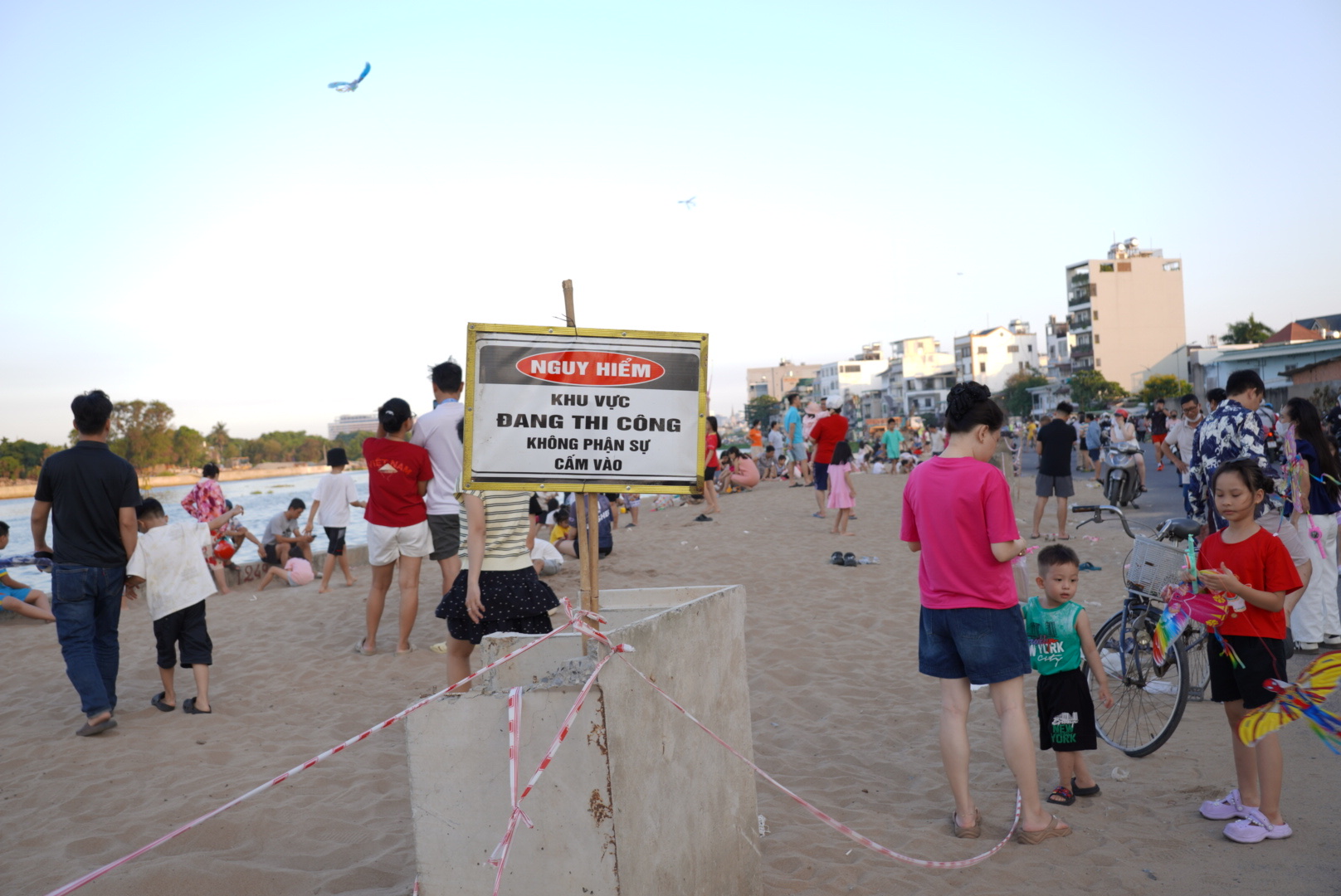 However, observations indicate that many people disregard the warnings, deliberately crossing the fence to enter and recreate. Residents sit enjoying the breeze, and children play on the sand, despite the surrounding litter. Additionally, motorbikes are parked extensively on the road, obstructing traffic and posing potential accident risks.