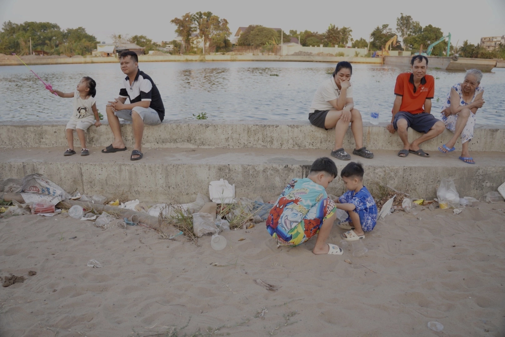Children and adults sit and play amidst the trash. Photo: Tuan Anh