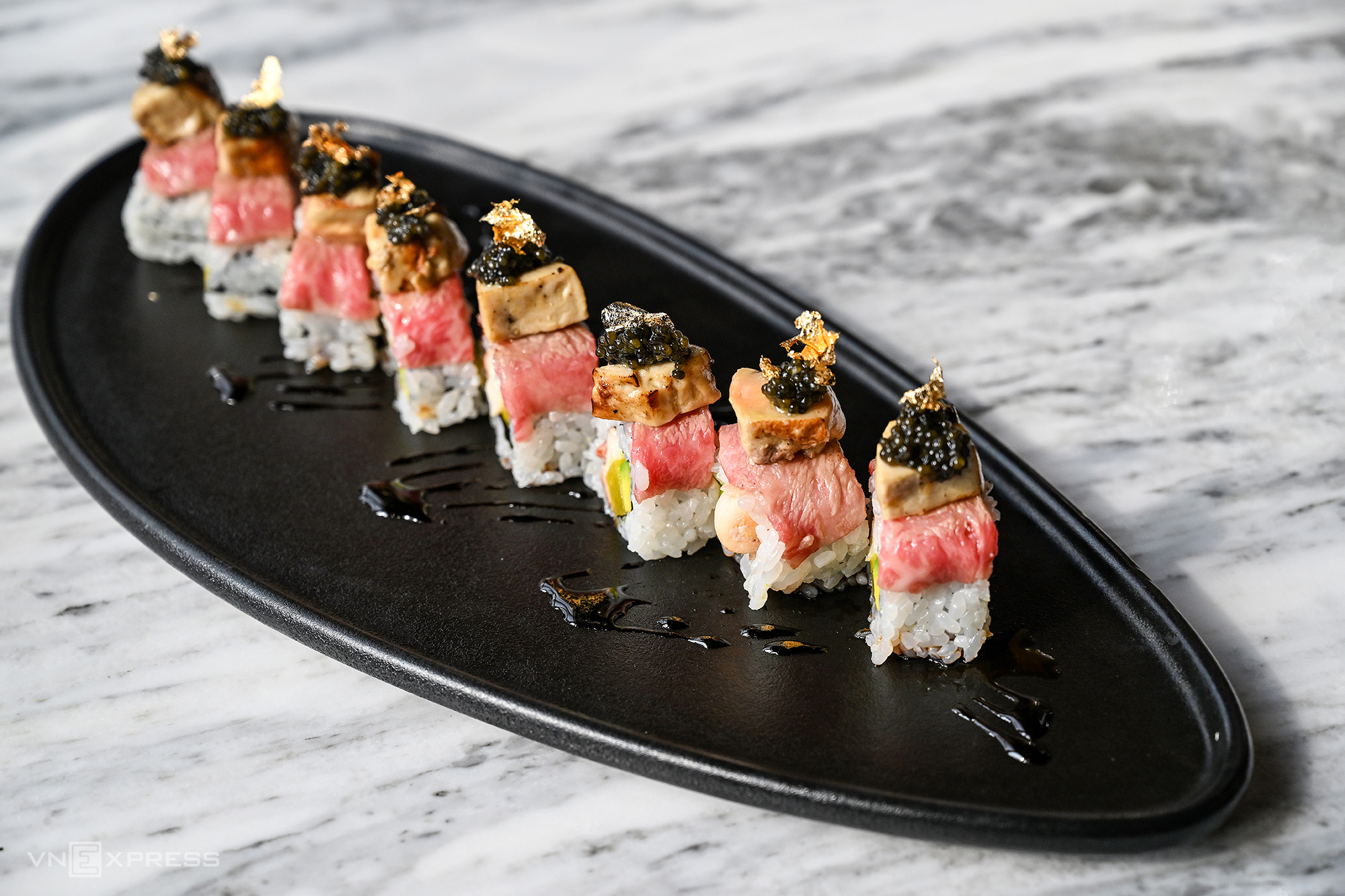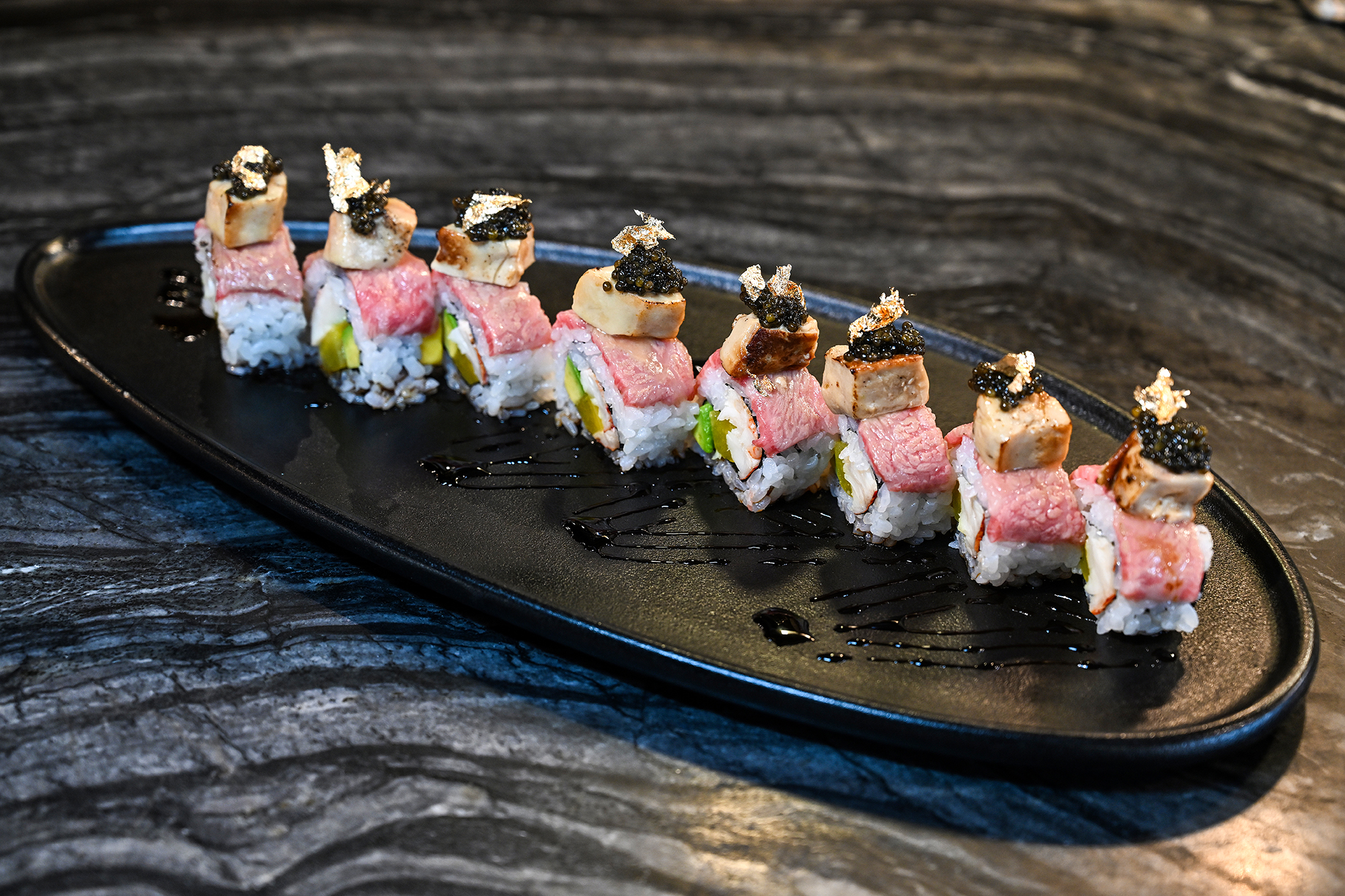 Thinly sliced Wagyu A5 beef tops the roll. This prized beef comes from the tenderloin of Japan's renowned Tajima black cattle, known for its rich marbling that melts in the mouth. "Sturgeon caviar, decadent French foie gras, and delicate gold leaf complete the dish," said chef James.