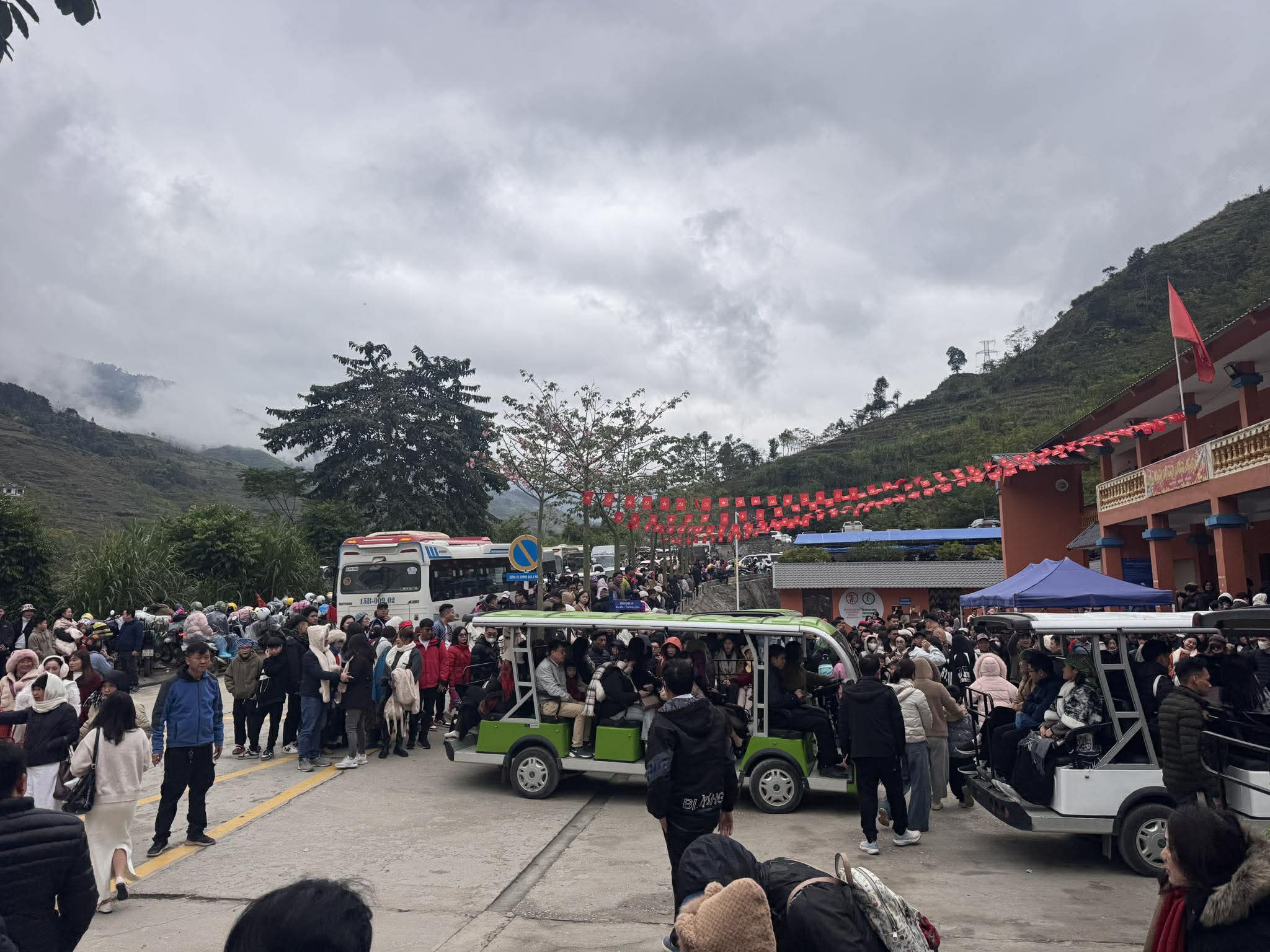 Upon arriving at Lung Cu Flagpole at 11h on 2/1, he explained that the entire group had to skip the site because they could not purchase electric car tickets to ascend the flagpole. The walking path consists of 1,000 steps, which many visitors found physically demanding, while hiring local motorbike taxis was difficult to manage for a group of over 30 guests.