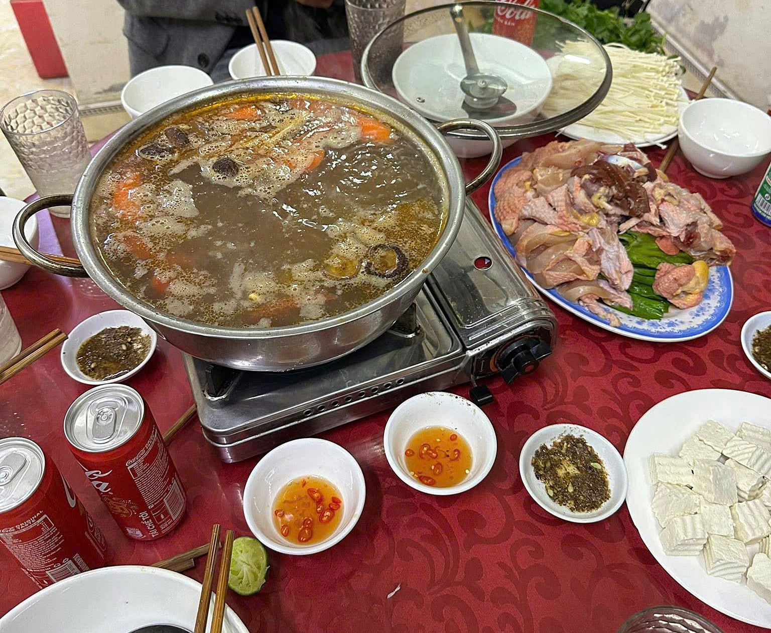 According to the owner, the price of a whole chicken is about 180,000 VND per kg, so a 1,2 million VND hotpot typically includes over 3 kg of chicken. The restaurant, which has been open for over 20 years, is a familiar stop for tour groups, serving over 400 visitors daily during holidays and Tet.