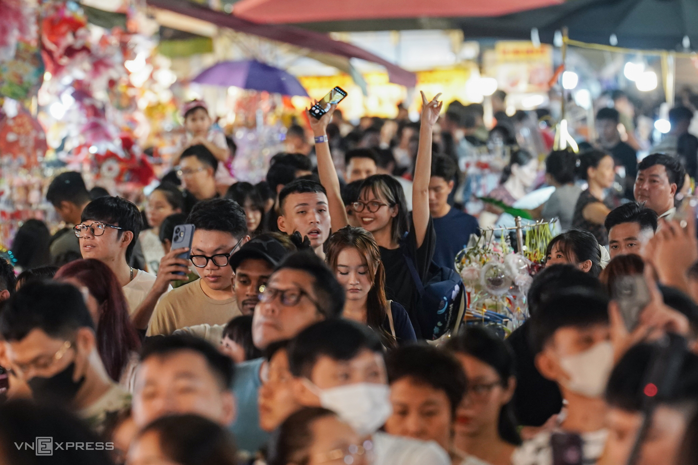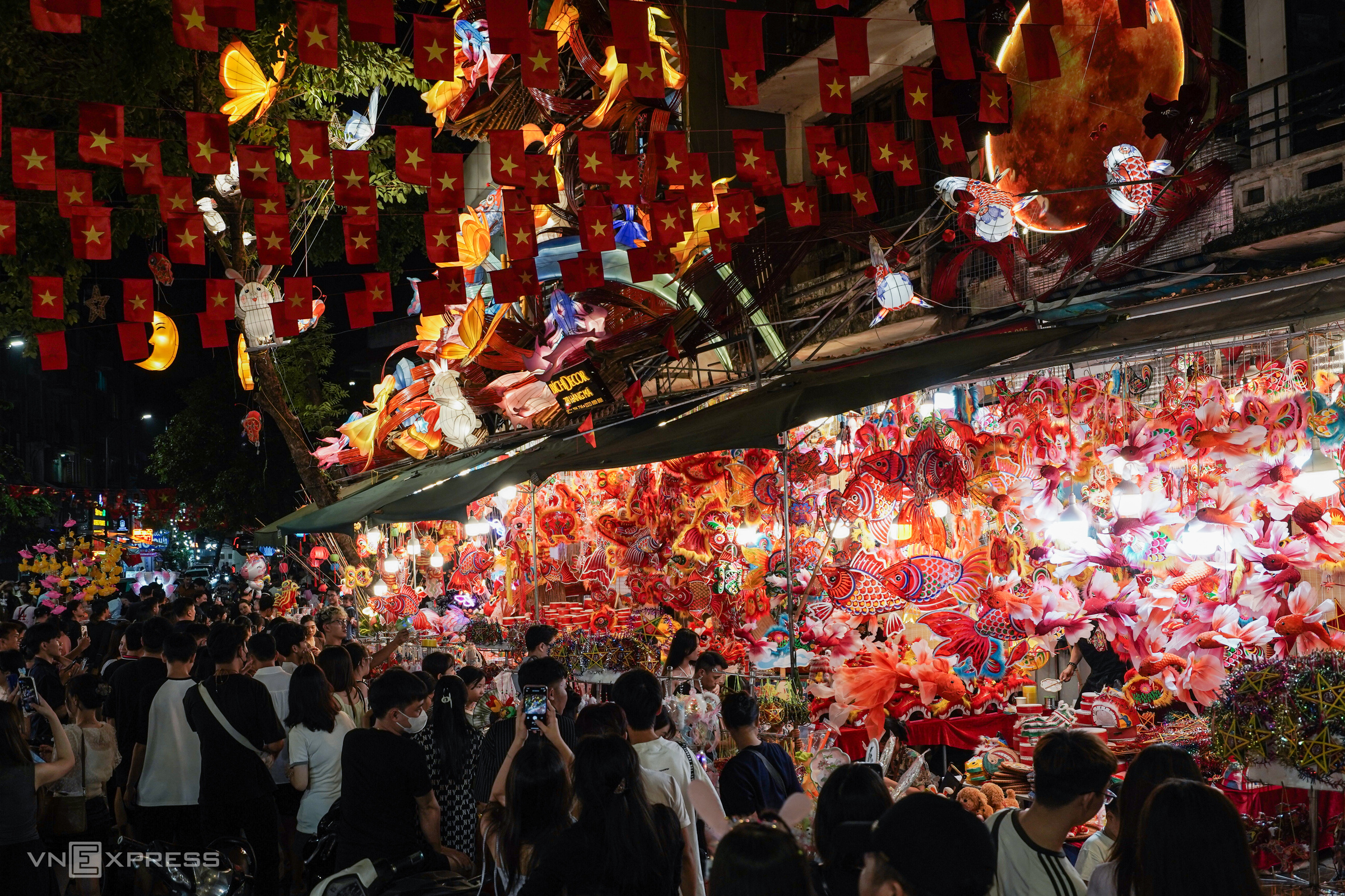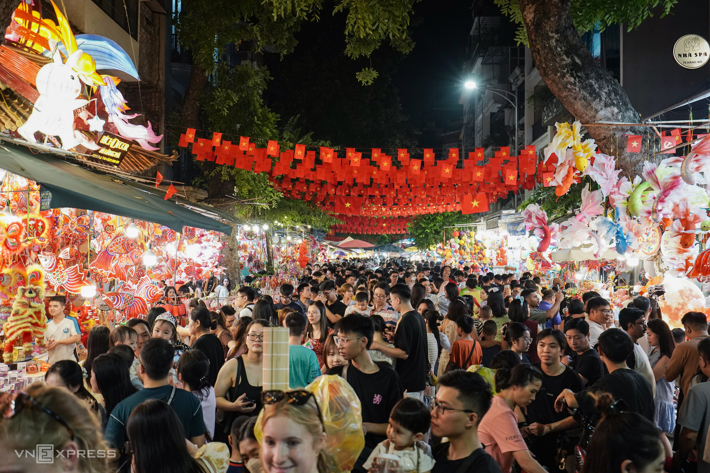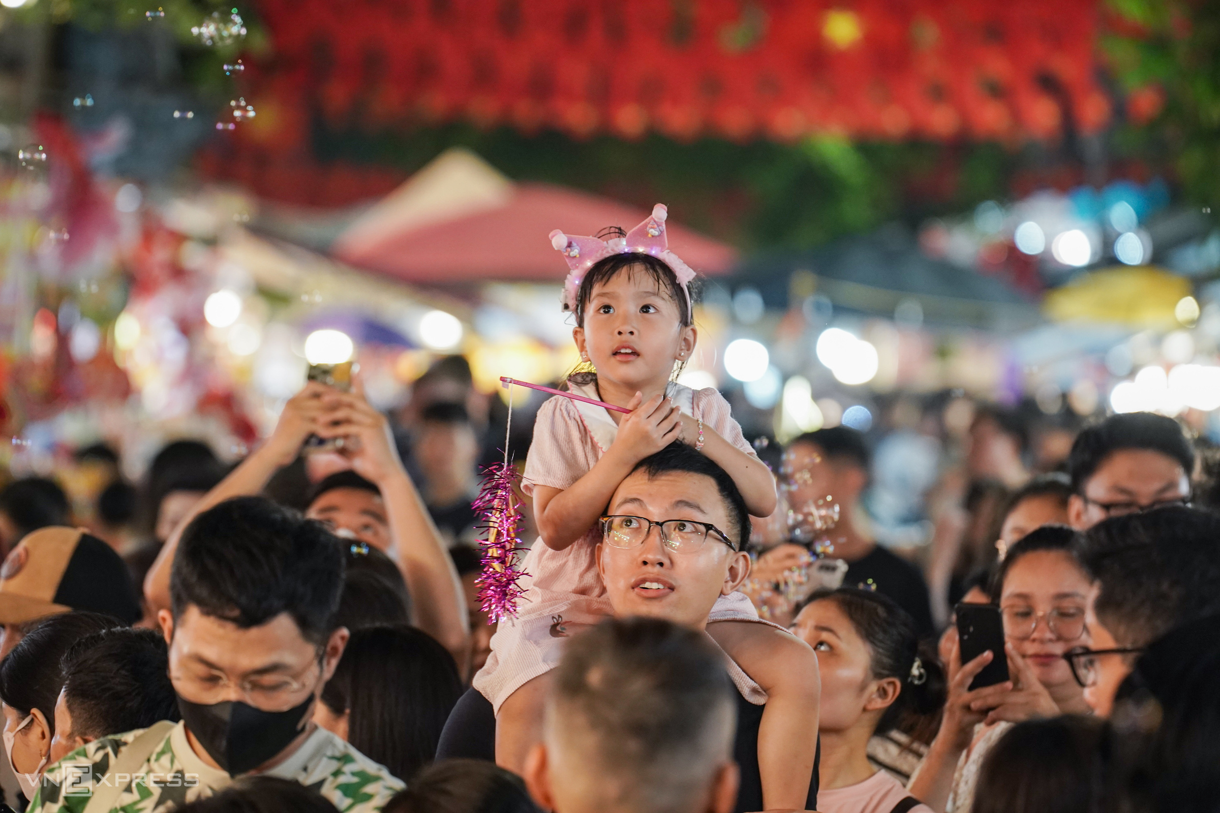 From 6 p.m., the old streets around Hang Ma street became crowded, with people inching along. Children were carried on their parents' shoulders to enjoy the view from above.
