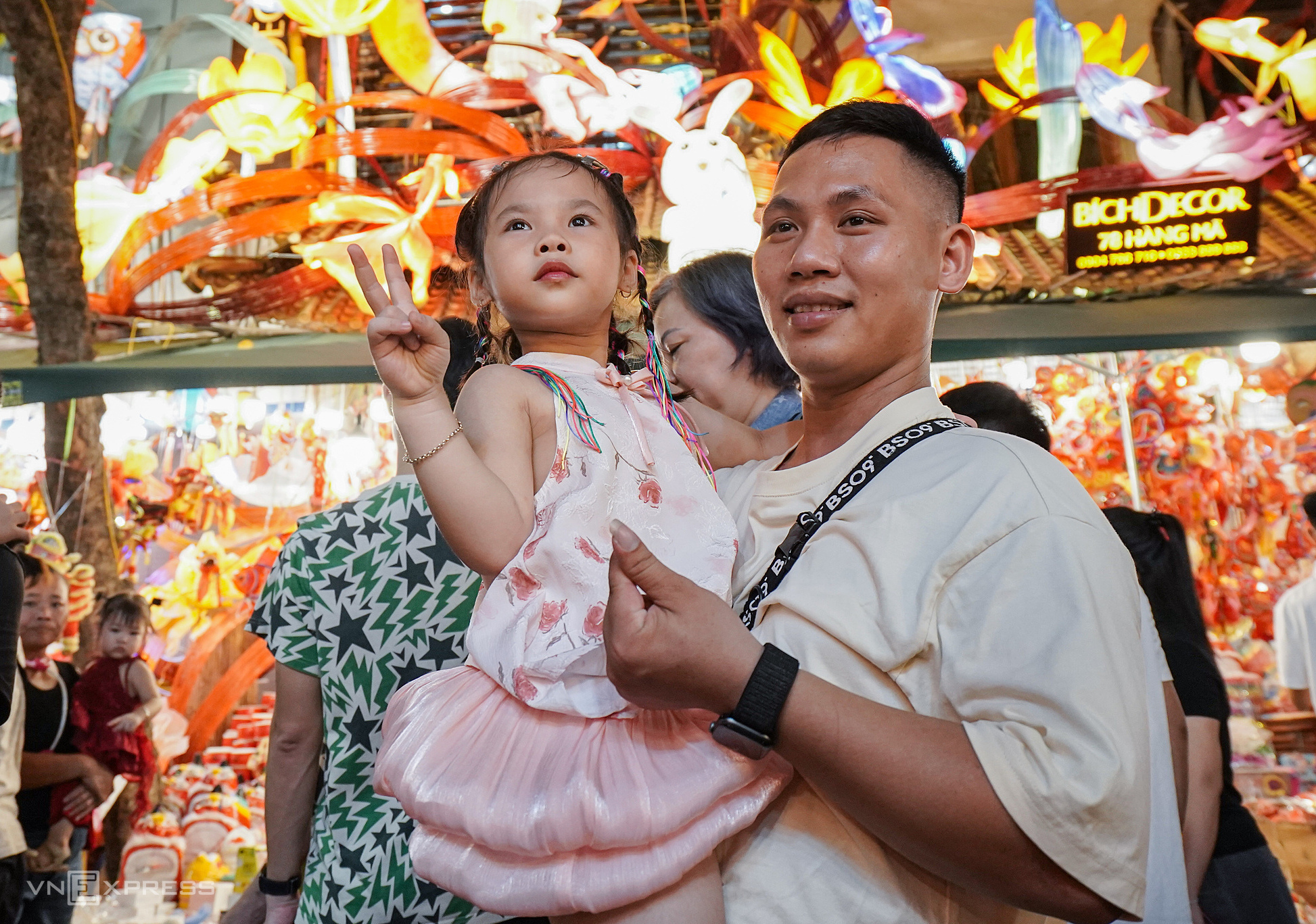 Nguyen Van Tuyen, 31, from Hoai Duc (Hanoi), traveled nearly 20 km to Hang Ma street with his family. This is the third consecutive year he has brought his children to the area to celebrate the Mid-Autumn Festival. Due to the large crowds, the family struggled to find a good spot for photos.