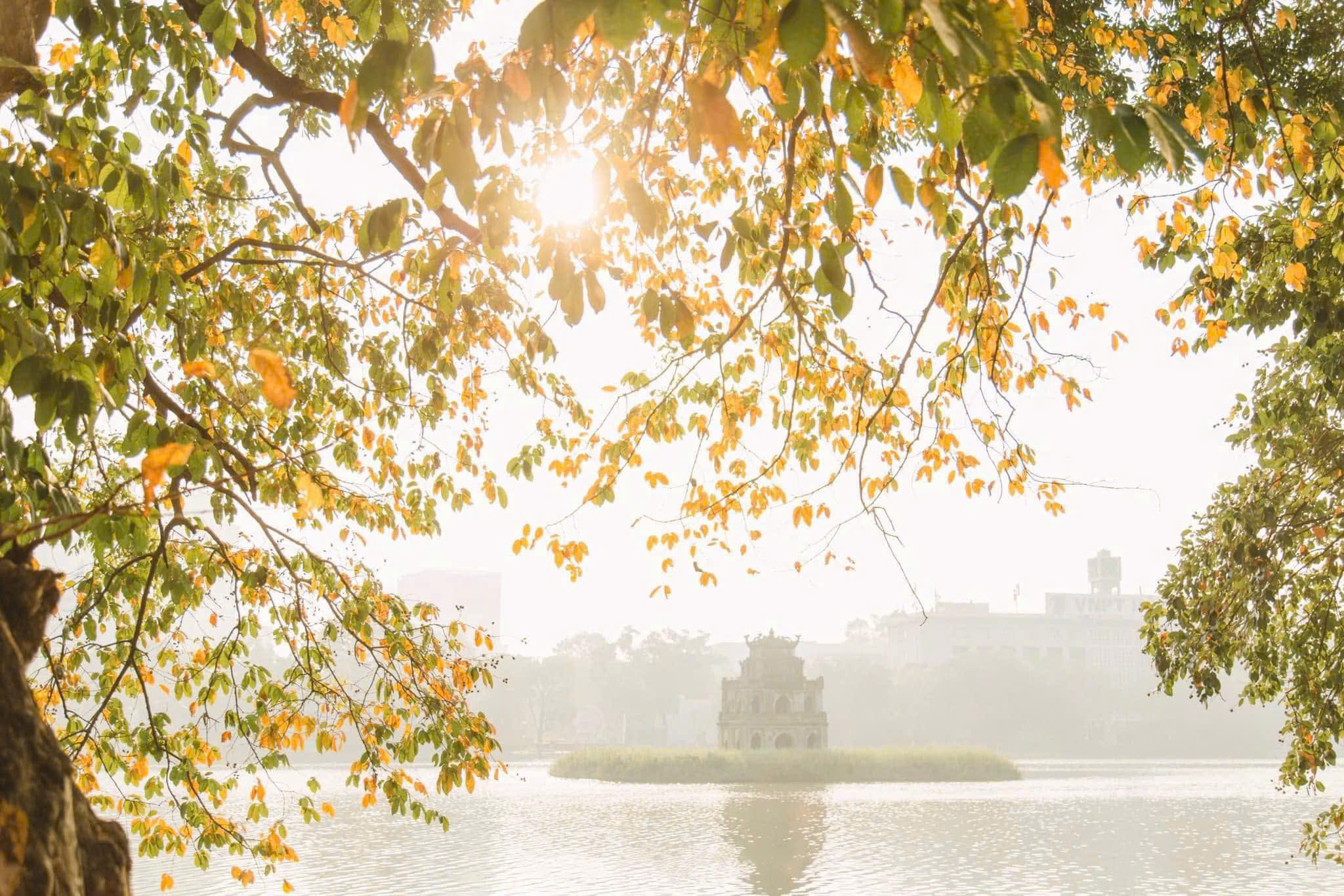 Golden leaves frame Hoan Kiem Lake in early September. Photo: Nguyen My Linh