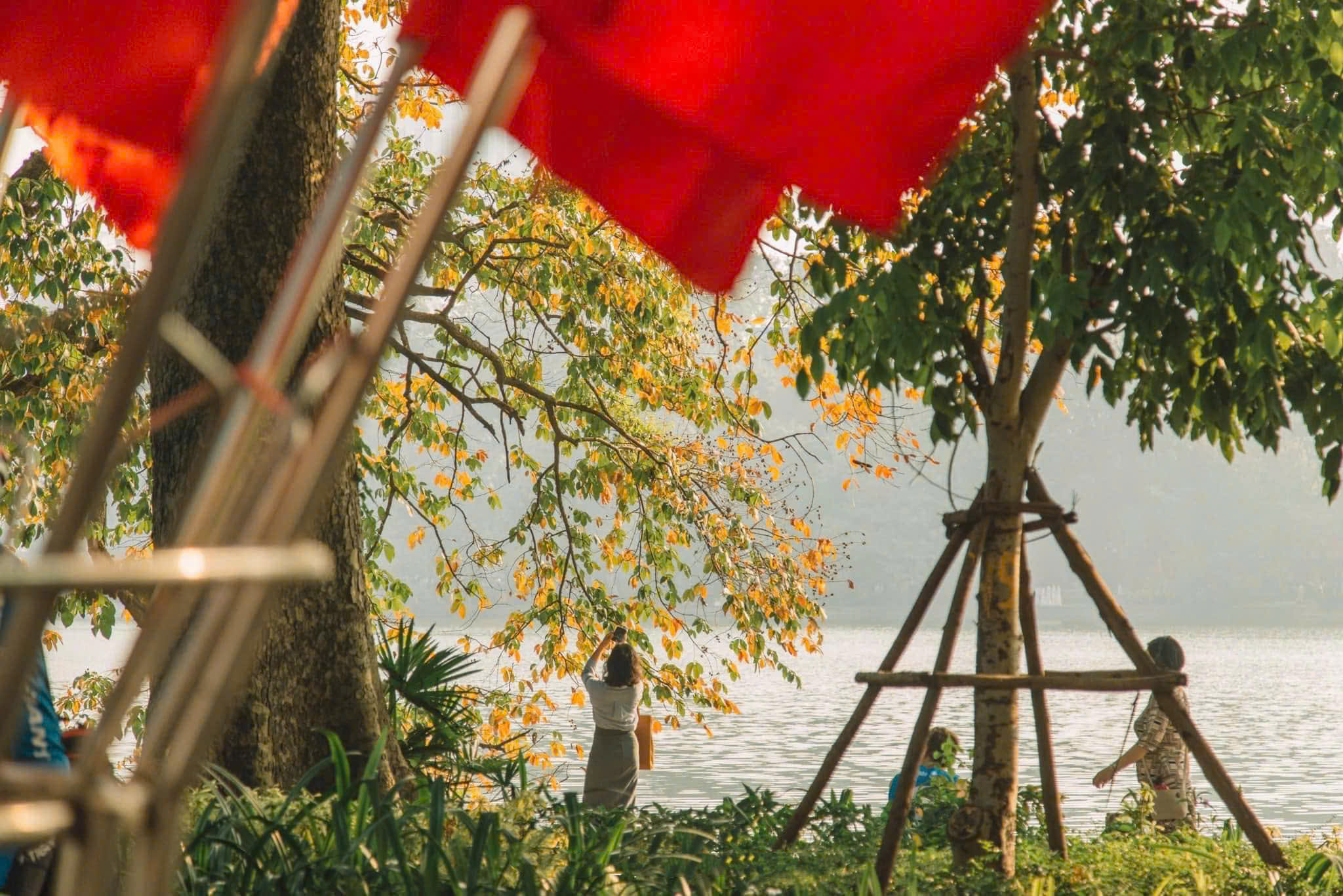Visitors capture the golden leaves at Hoan Kiem Lake in early September. Photo: Nguyen My Linh