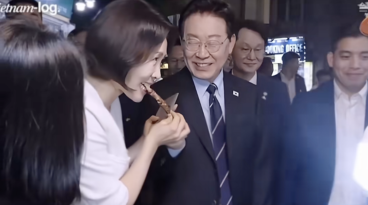 The South Korean president and first lady sharing a grilled meat skewer at a street-side eatery. *Screenshot from Vietnam-Log video*