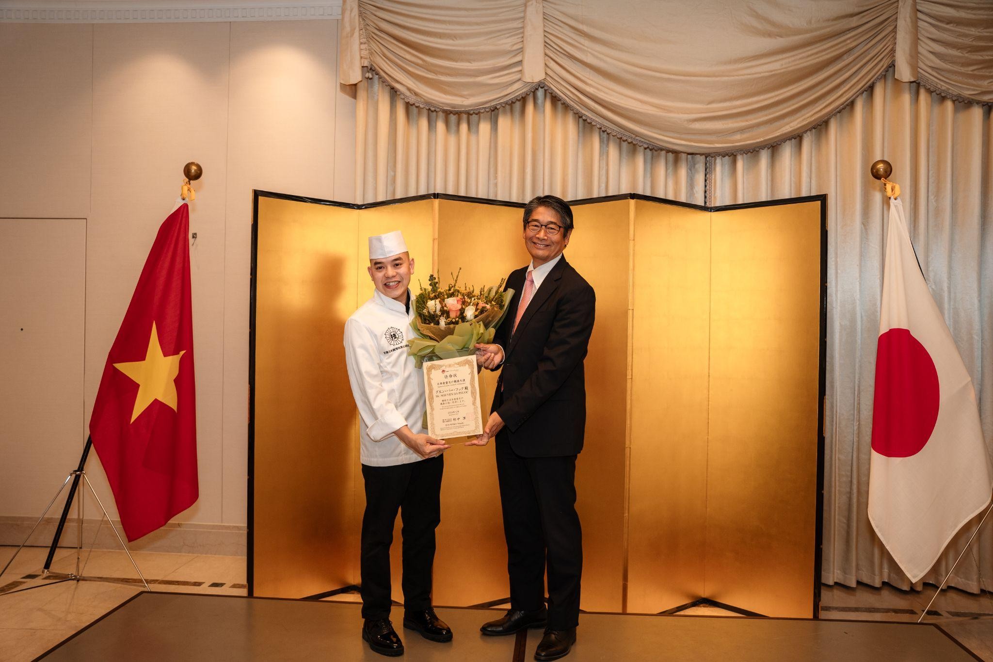 Ambassador Extraordinary and Plenipotentiary Naoki Ito (right) presents the decision to Chef Fuku Nguyen - Nguyen Ba Phuoc (left). Photo: Hatoyama