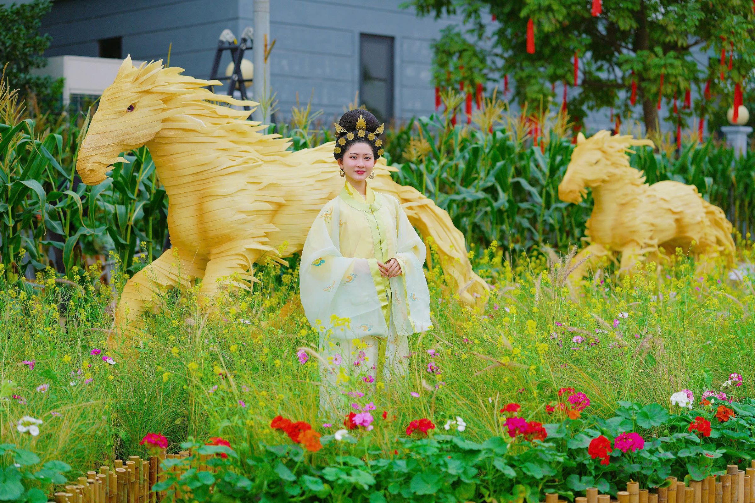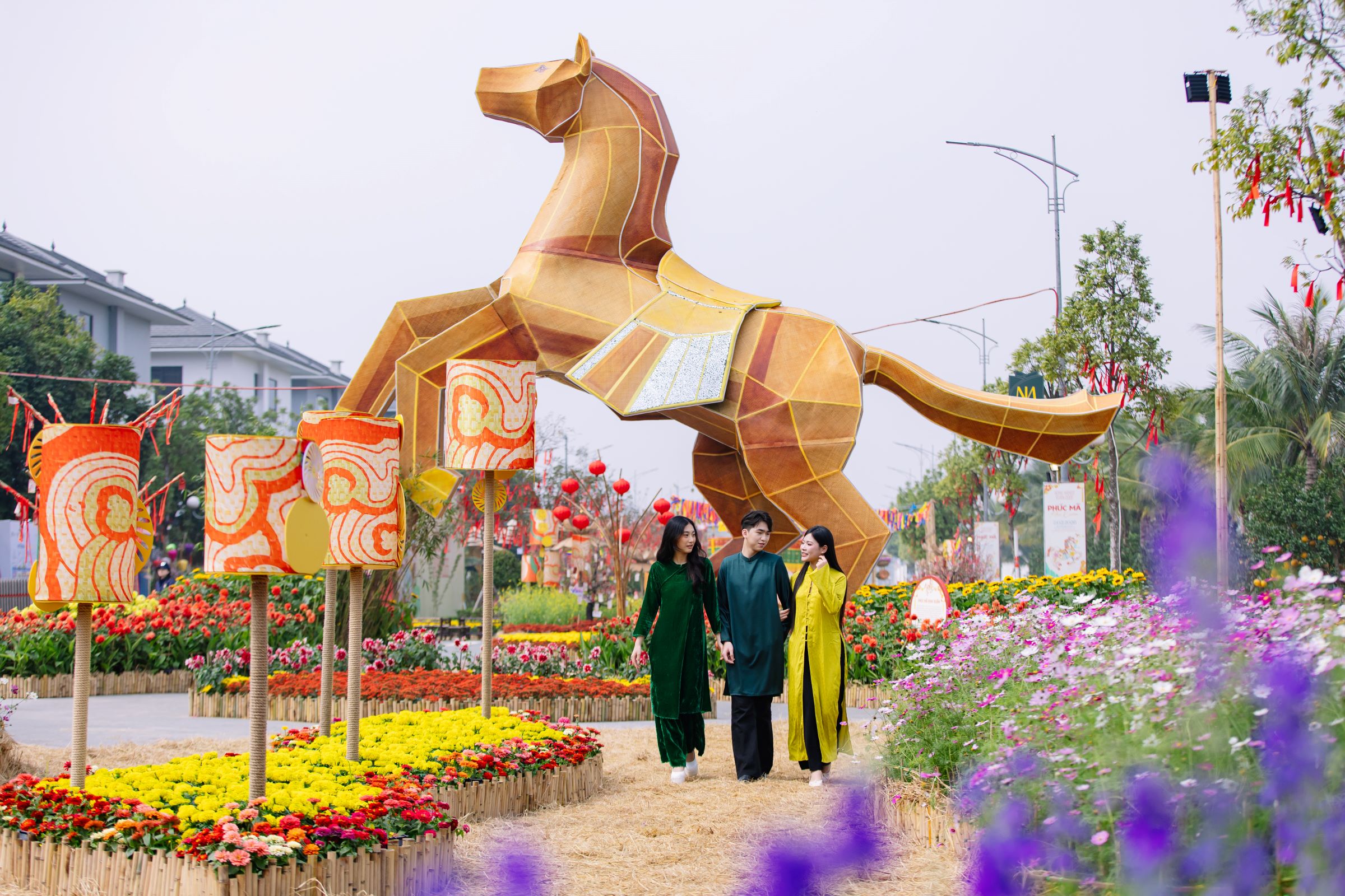 The horse mascot, standing over 7 meters tall, symbolizes the flower street's "Phuc Ma Phi Xuan" theme and drew many visitors. This lacquer artwork conveys messages of strength, resilience, and aspirations for new year growth, chosen by organizers to tell the spring story in West Hanoi's urban setting.