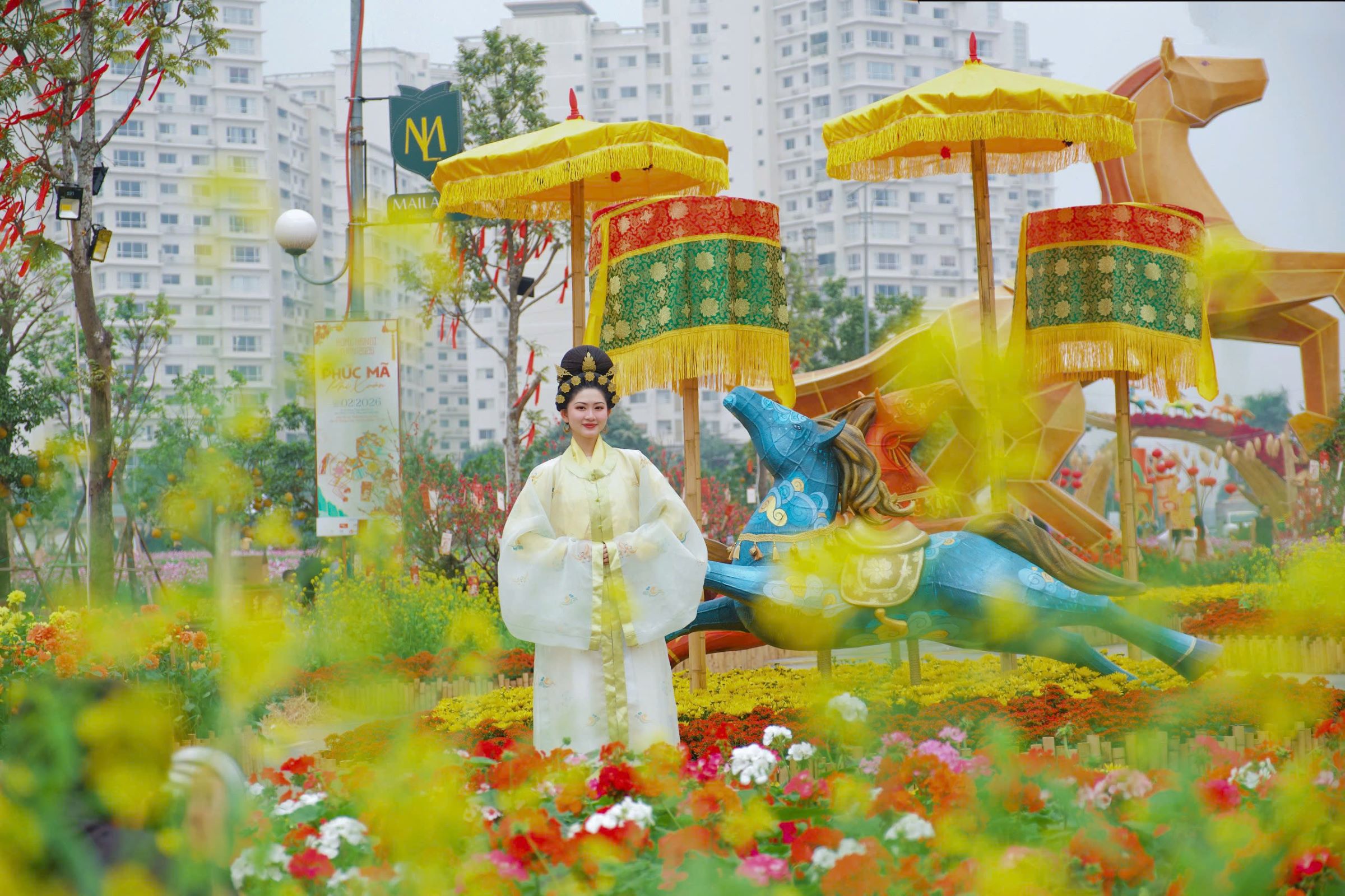 With the colorful flower garden as a backdrop, many women dressed up for early-year souvenir photos. Wearing ao dai and traditional costumes enhances visual appeal and evokes a traditional atmosphere within the modern setting. Tuyet Mai, a TikTok content creator showcasing Vietnamese attire, visited the flower street early. She noted that this year's Home Hanoi Xuan features many detailed miniature landscapes, ideal for photography.