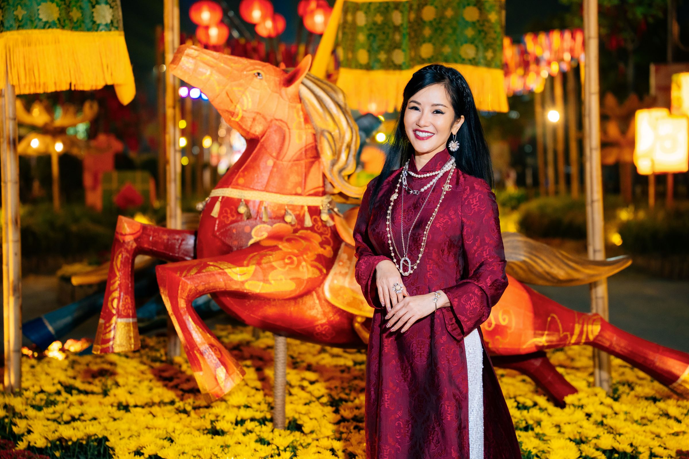 Appearing at the opening night of the Home Hanoi Xuan flower street, diva Hong Nhung radiated youth in a red brocade ao dai and jewelry.