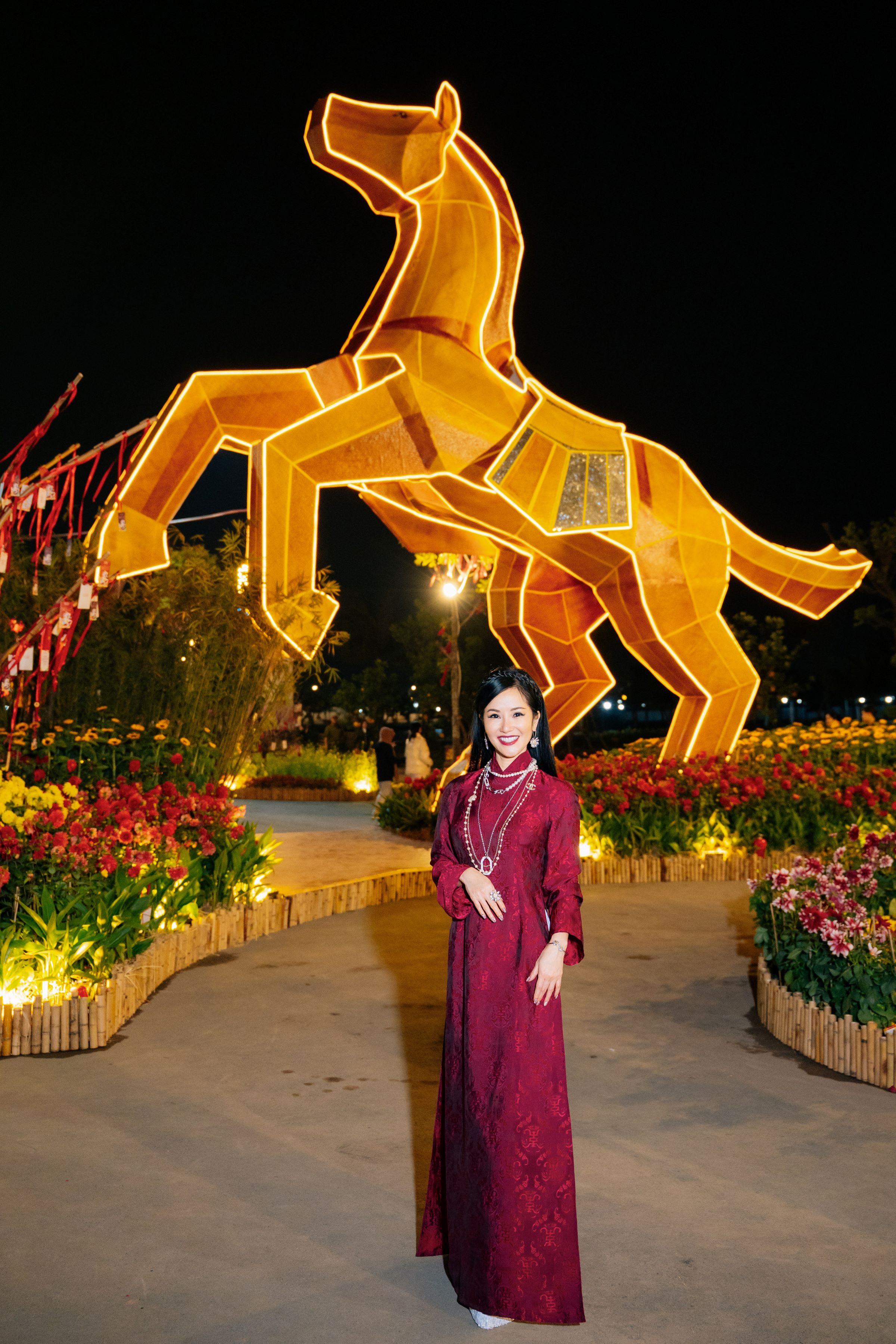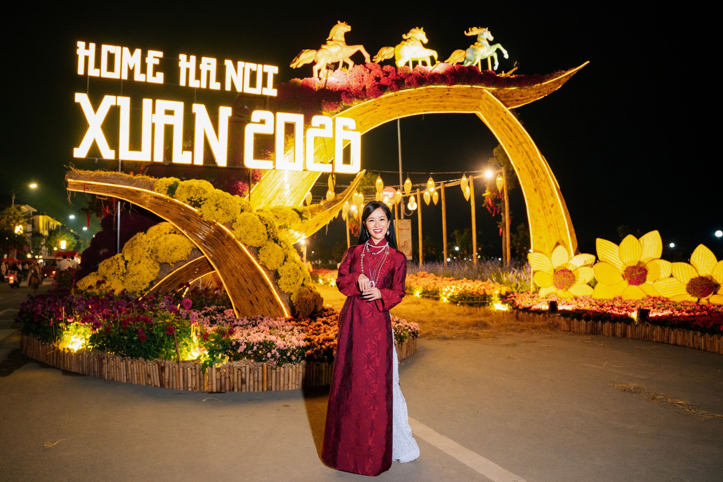 Hong Nhung posed beside the Phuc Ma mascot at the Home Hanoi Xuan flower street 2026. Organizers installed lighting to accentuate the flower clusters and mascots.