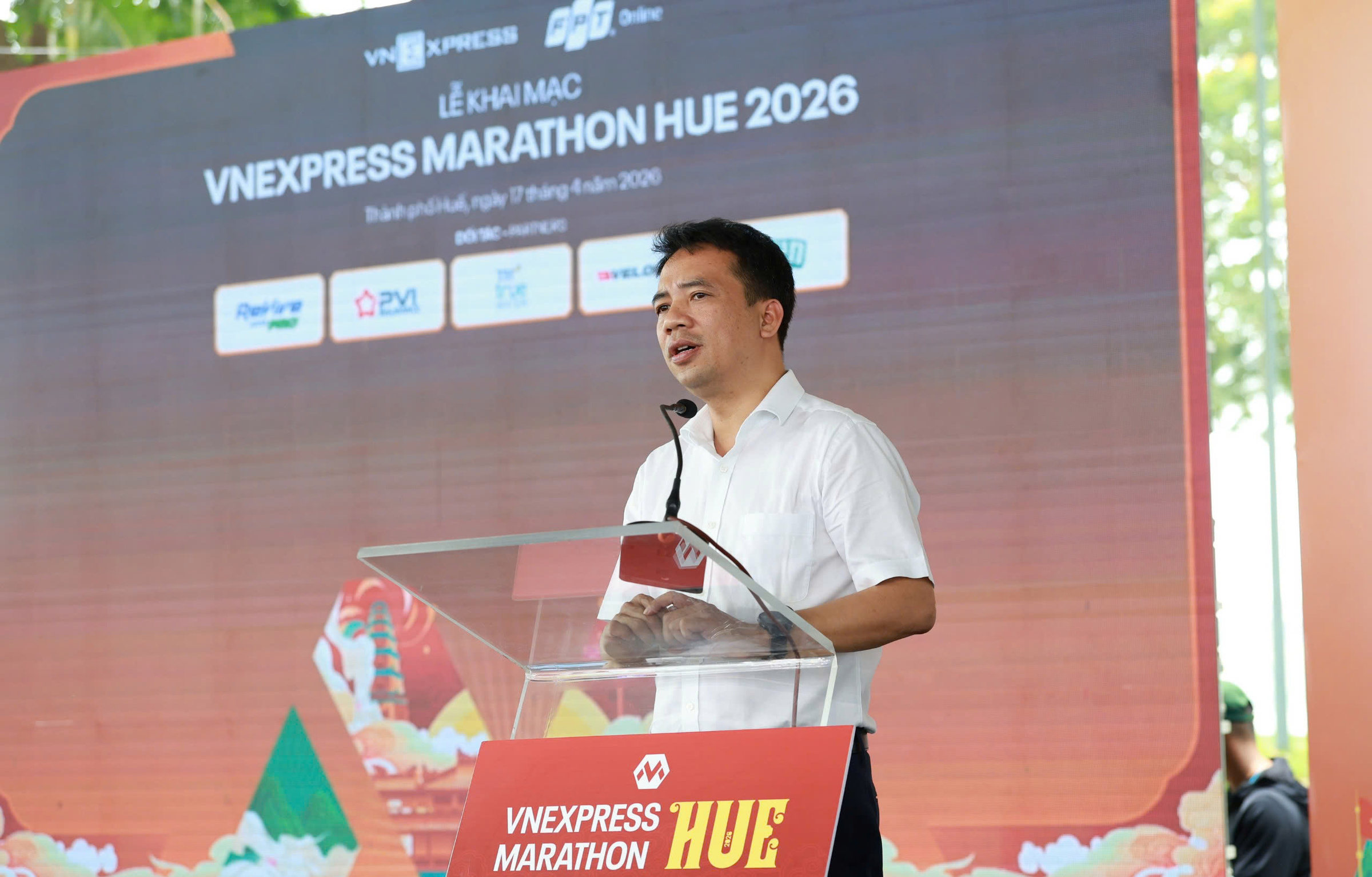 Tran Huu Thuy Giang, Vice Chairman of Hue City People's Committee, shared this information at the opening ceremony of the race at noon on 17/4. Giang has been involved with the VnExpress Marathon since its inaugural season in 2020, when he worked at the Thua Thien Hue Provincial Department of Tourism, witnessing the event's growth over several seasons.