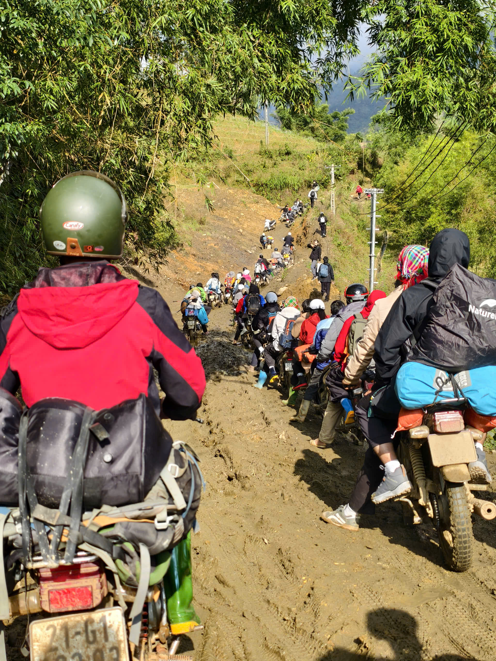 Motorbikes line up to descend the mountain. *Photo: Nguyen Trong Cung*
