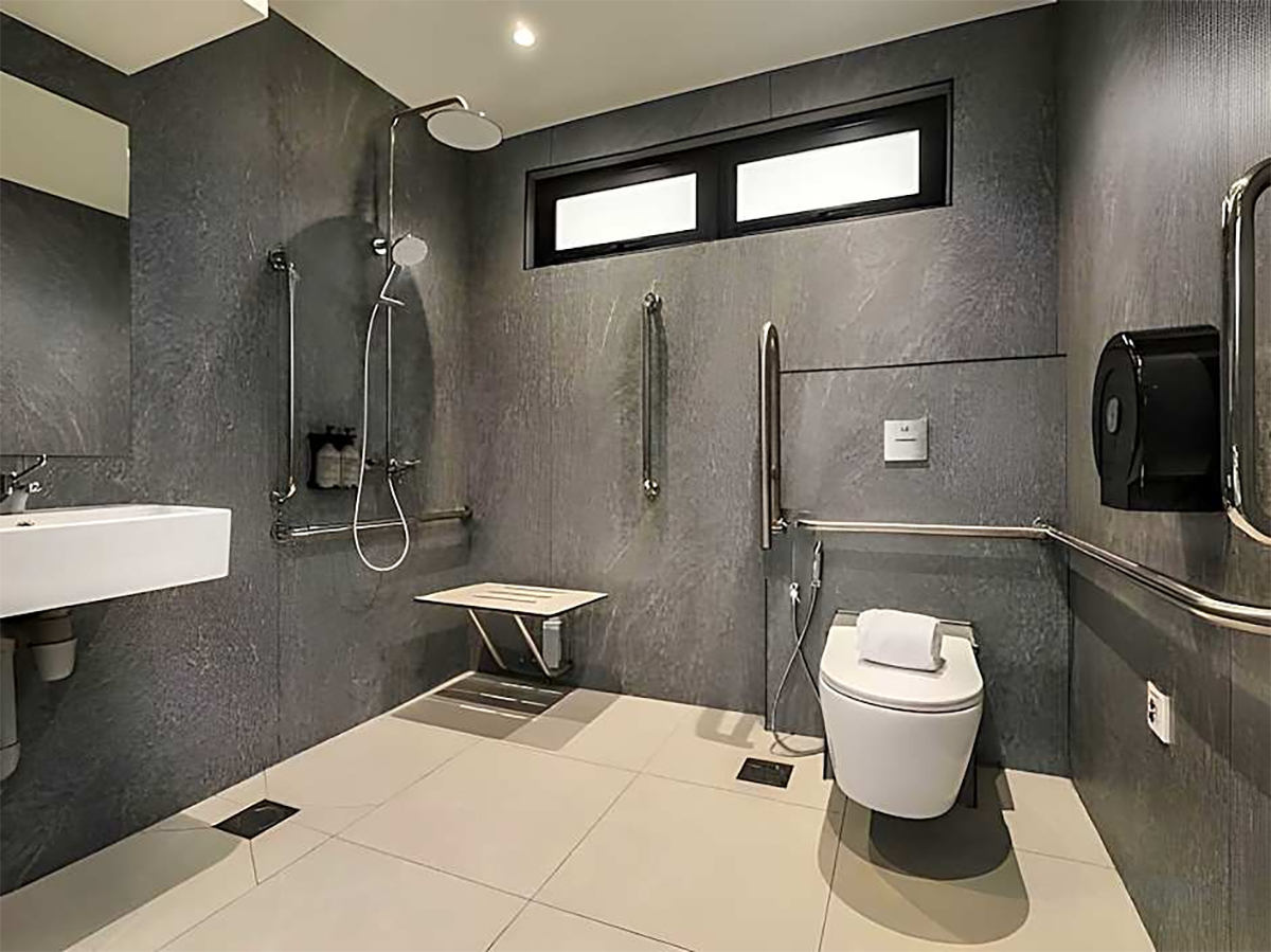 The Pioneer North room includes grab bars in the toilet and shower areas, catering to the needs of elderly guests.