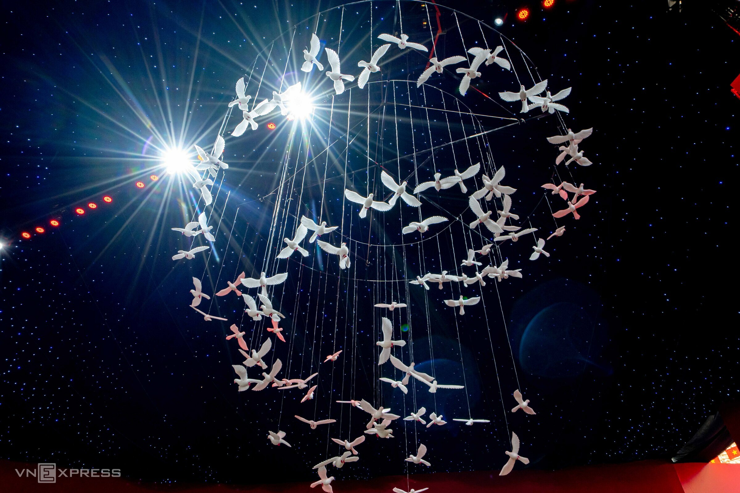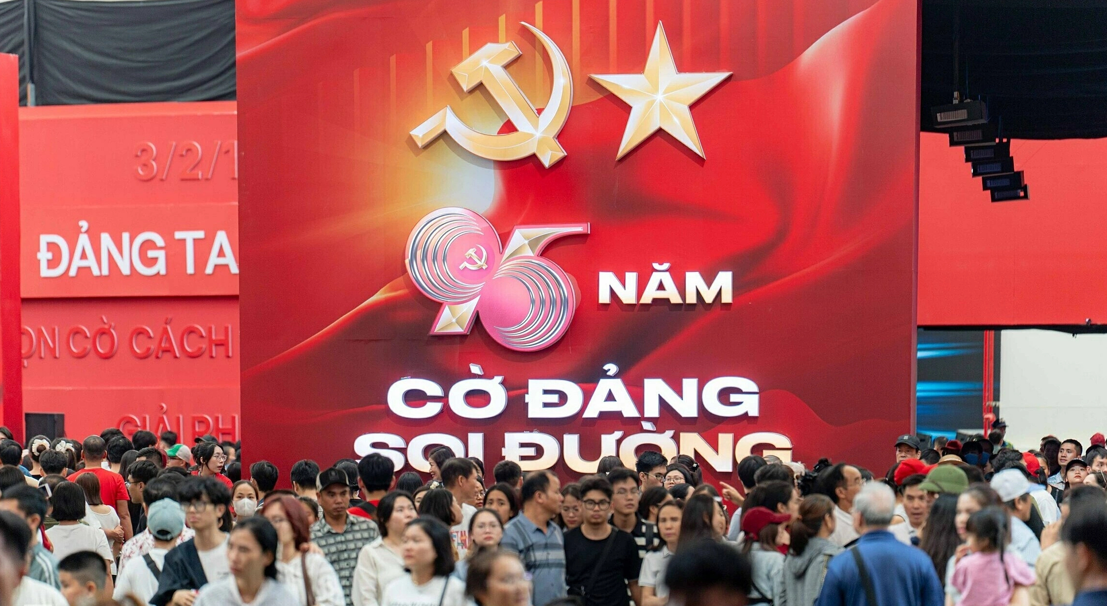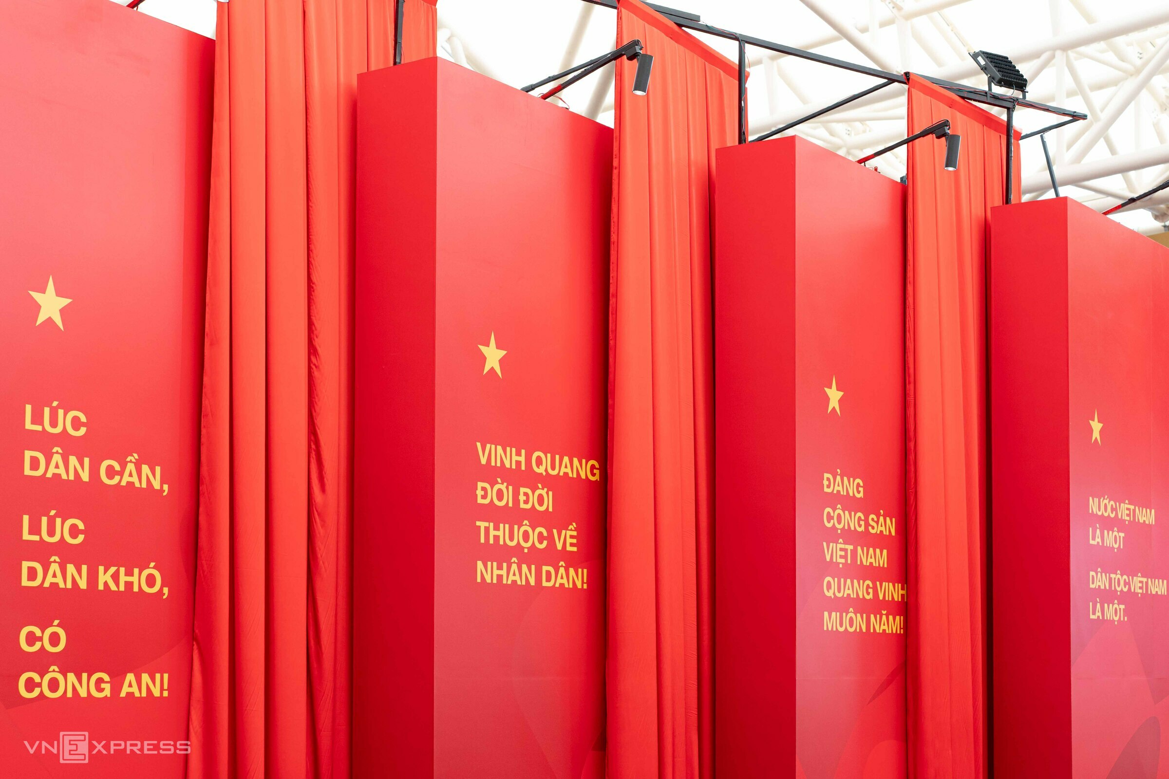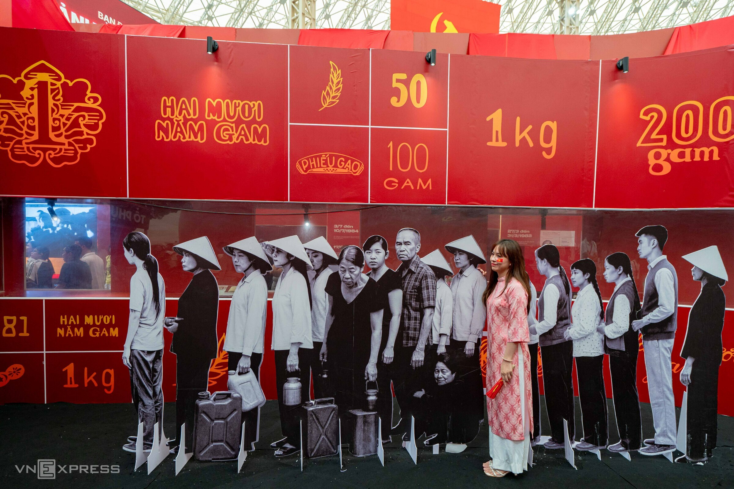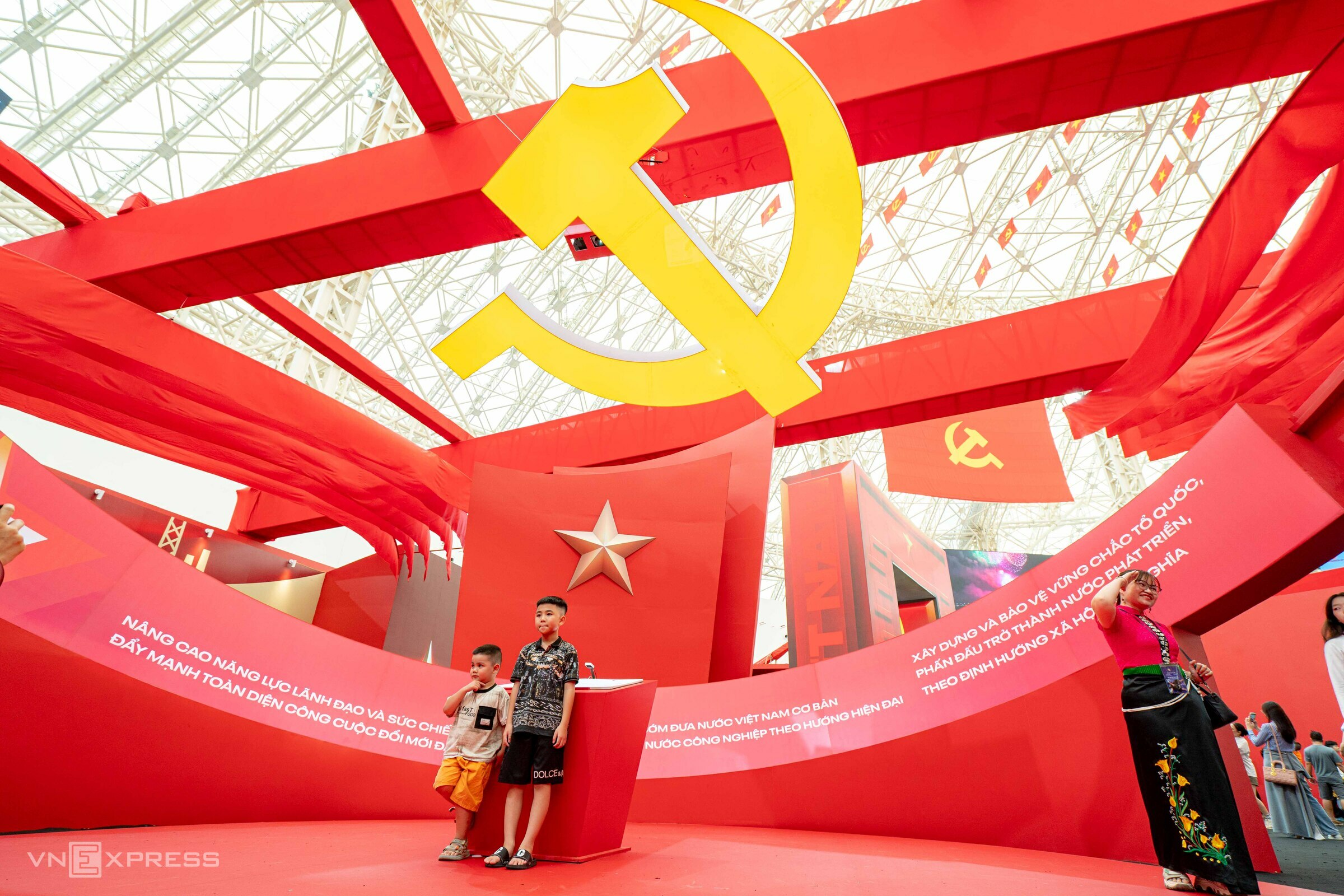 The exhibition also features prominent backdrops with Party symbols, such as a large golden hammer and sickle hanging high, a red star in the center, and red ribbons swirling around. These visual highlights make it easy for visitors to capture impressive photos, imbued with a solemn atmosphere and historical significance. |