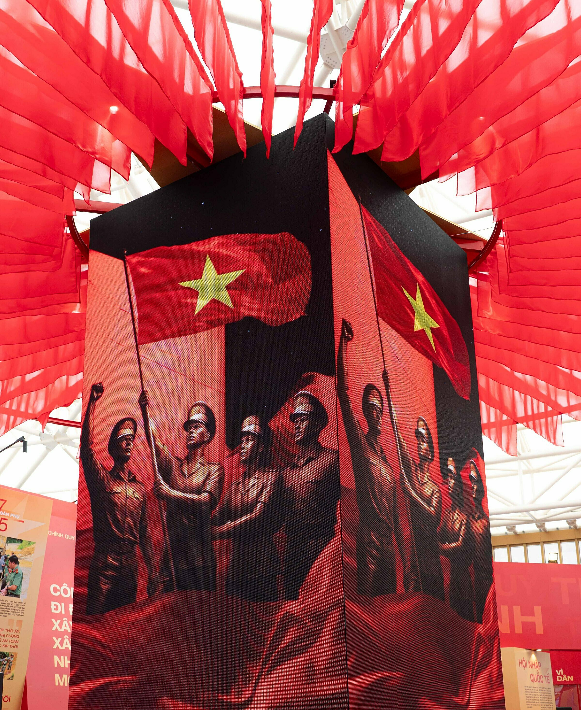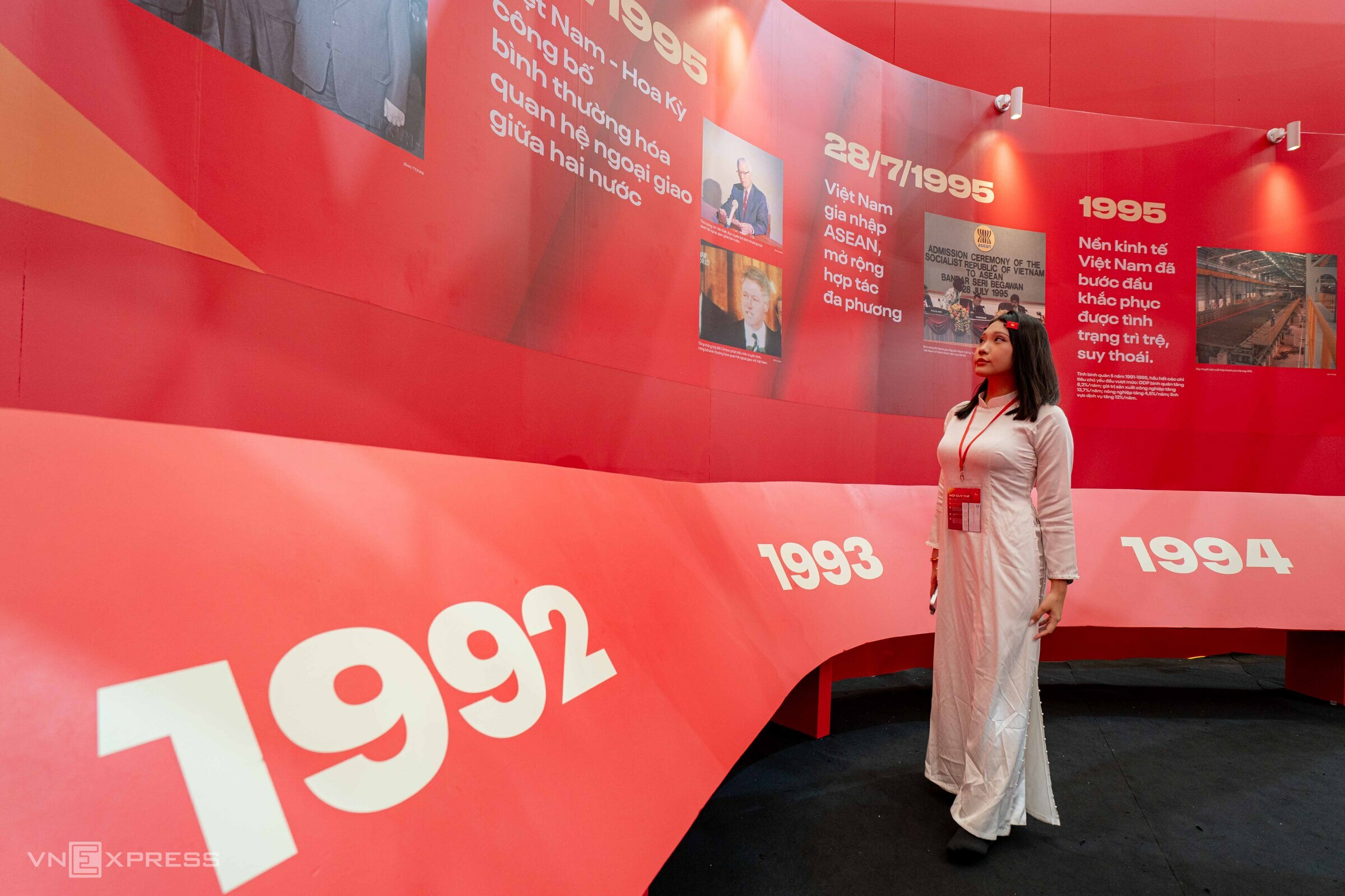 This area makes a strong visual impact with its dominant red color scheme and a system of curved iron frames forming a dome. From this dome hang large newspaper pages and posters marking important historical milestones. The presence of President Ho Chi Minh's image and headlines about Party Congresses adds a sense of solemnity and evokes memories of historical events.