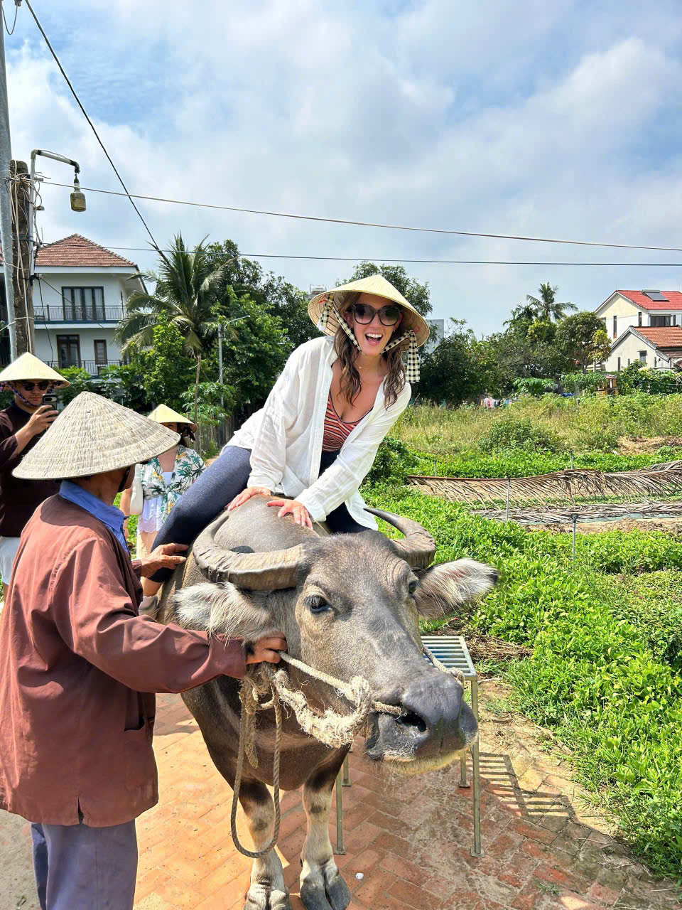 International tourists experience water buffalo riding in Tra Que Vegetable Village, Da Nang. Photo: Vietluxtour